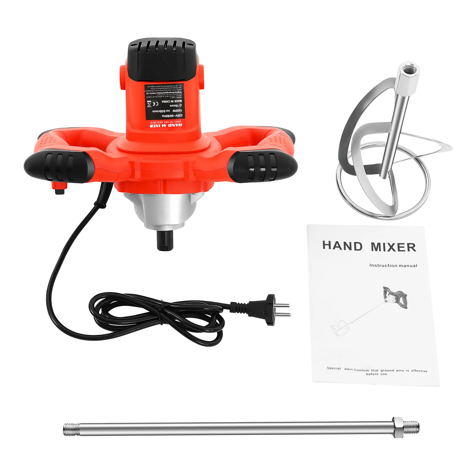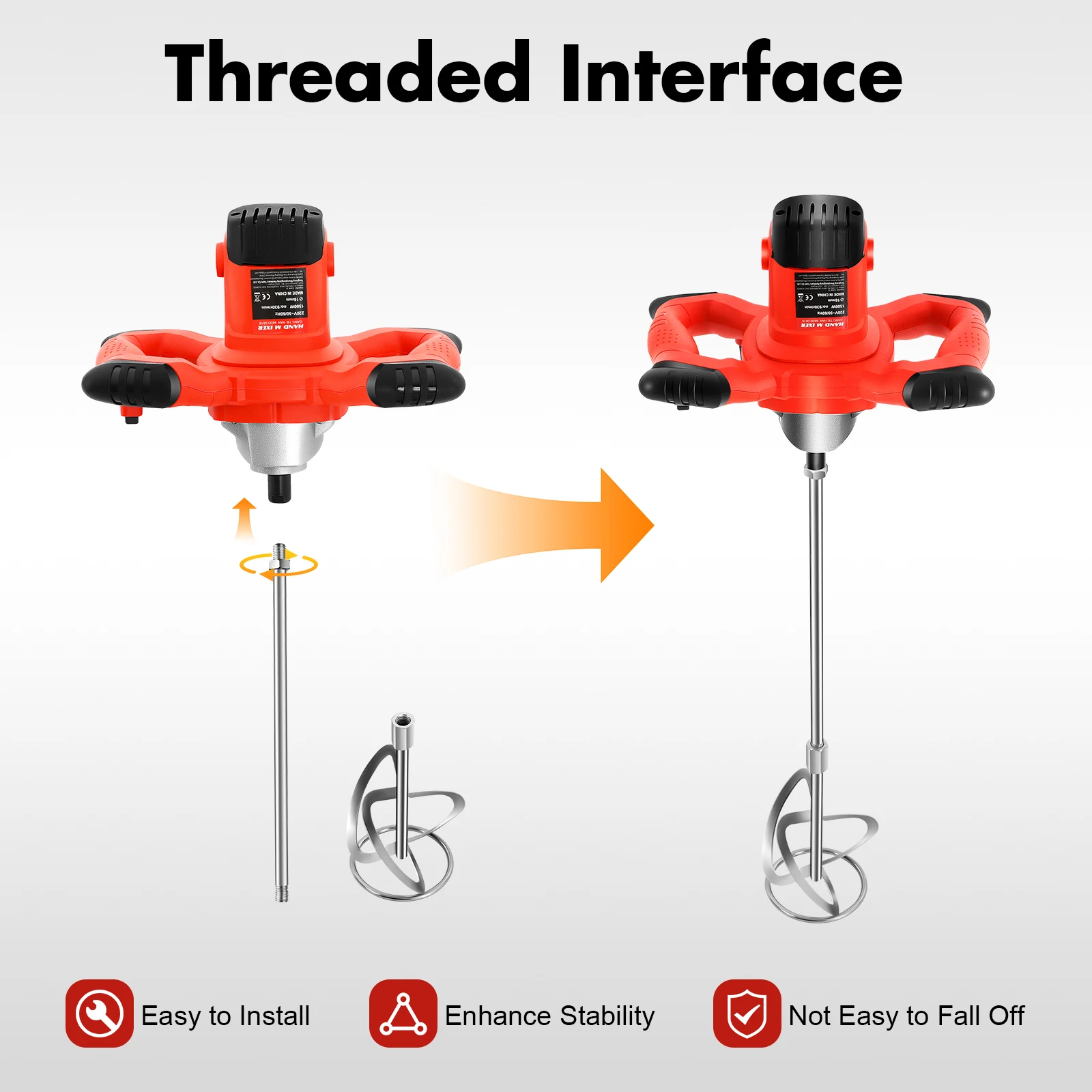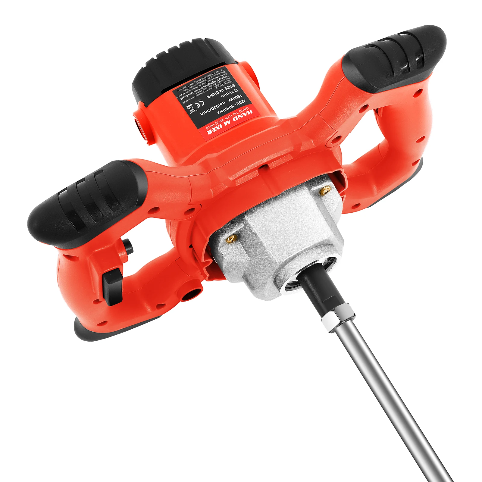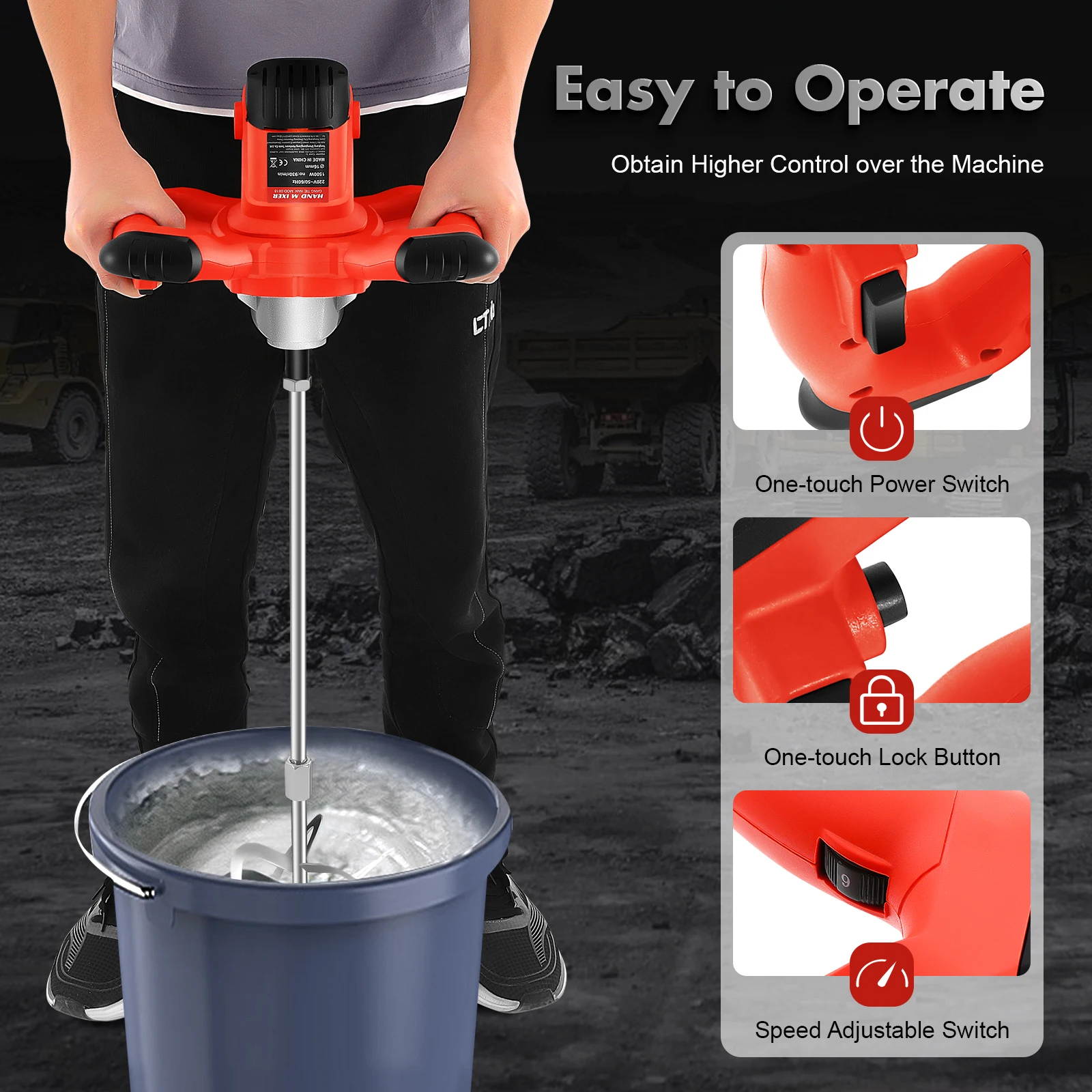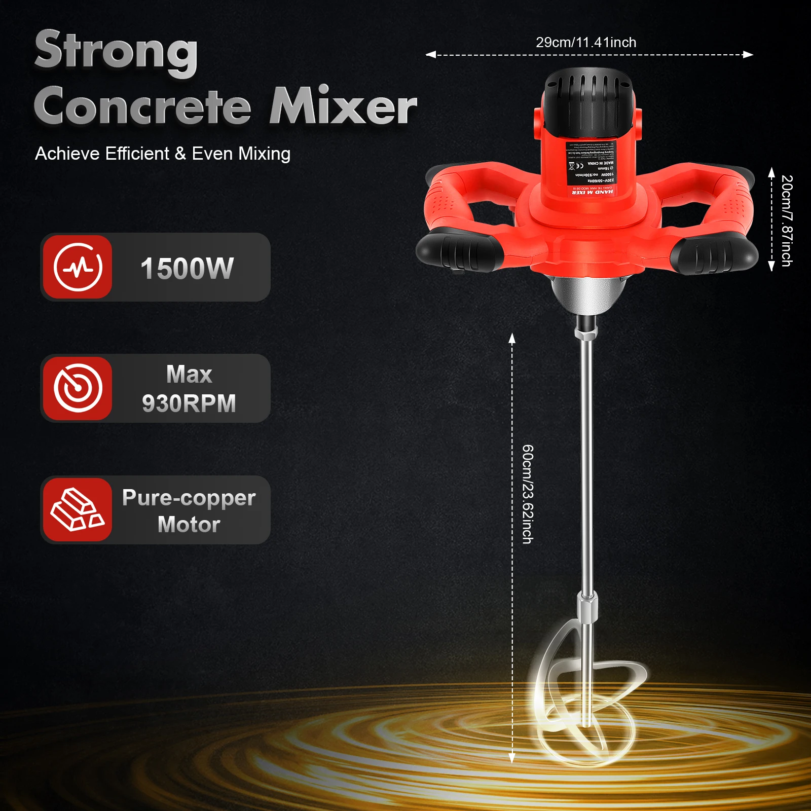 With 1500 watts of power and a maximum speed of 930 rpm, this portable concrete mixer will greatly improve the efficiency of mixing concrete, slurry and sand. What's more, its flywheel-style double nylon handle gives you a firm grip and easy operation, so you can work for long hours without fatigue.