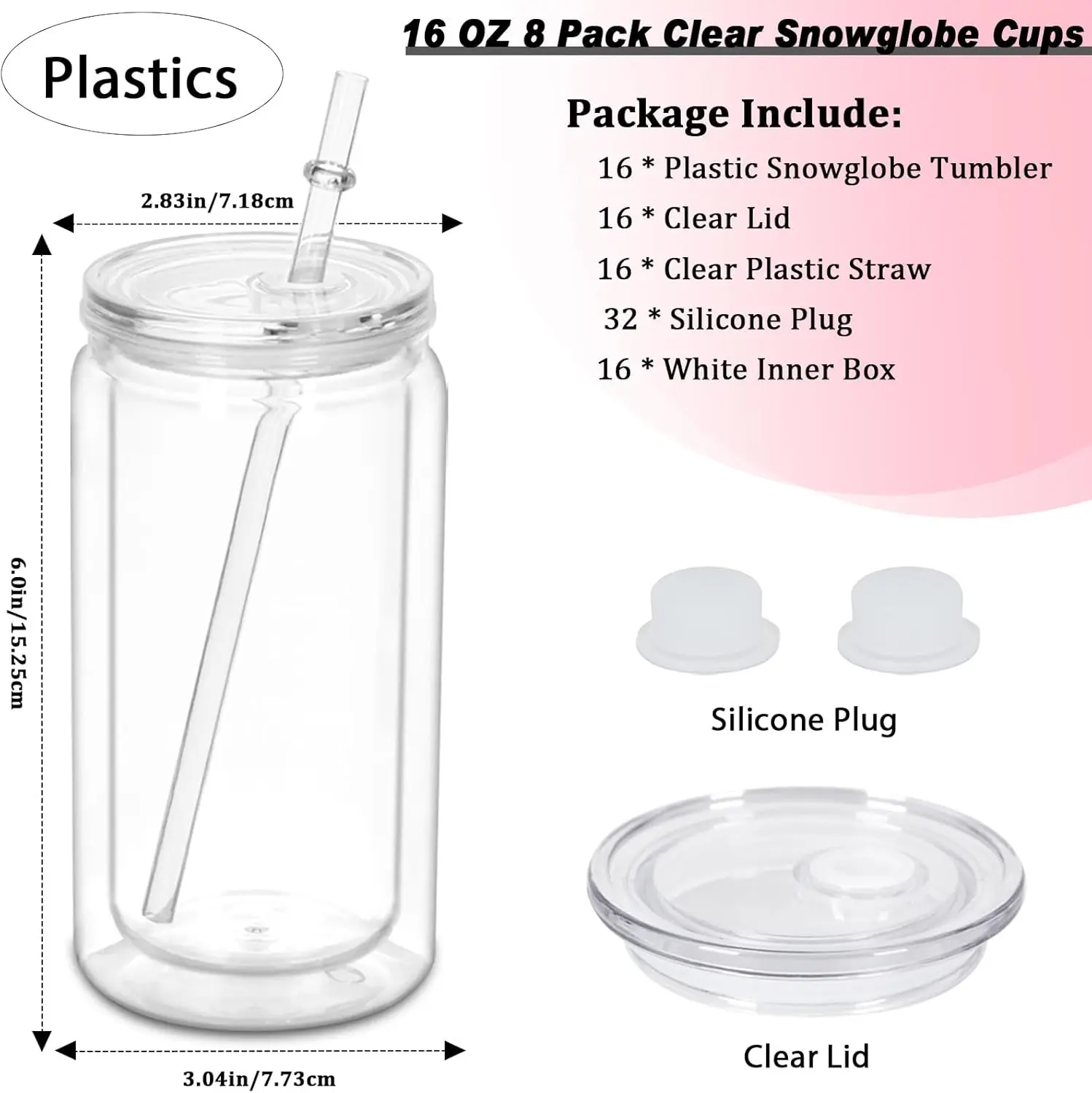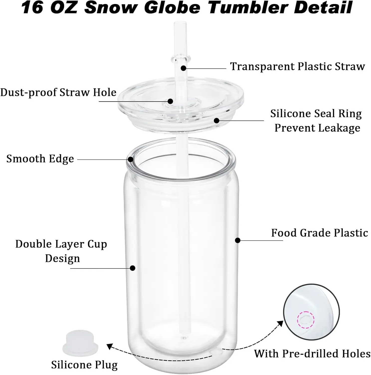 16 oz Plastic Snow Globe Tumbler, 16 Pack Double Wall Snowglobe Tumbler with Pre Drilled Hole, Plastic Mason Jar Cups Can(Clear)