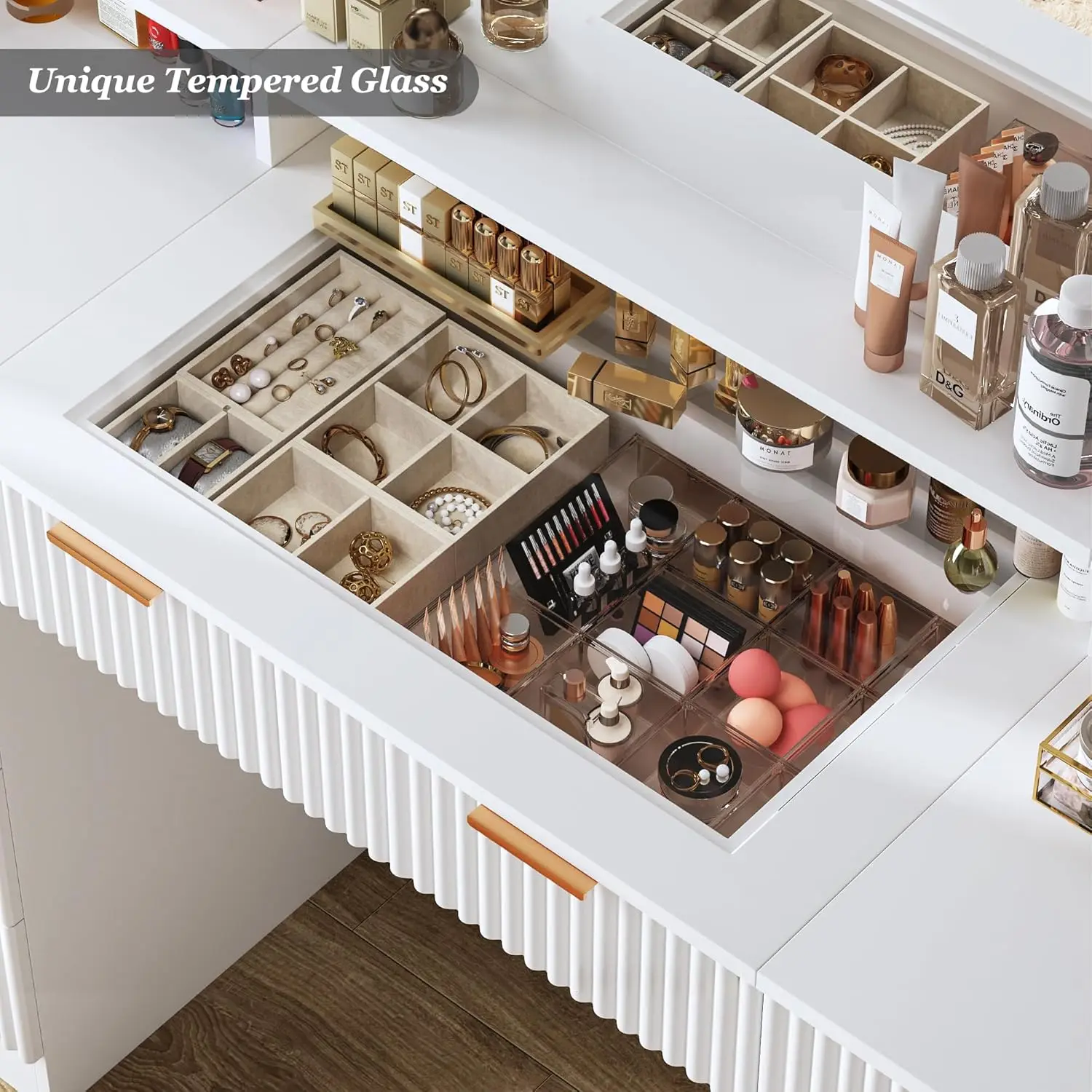 3. Glass Tabletop Vanity: Unique tempered glass provides a transparent aesthetic and is positioned on the vanity desktop above the central large drawer, allowing for a clear view of the items stored inside.