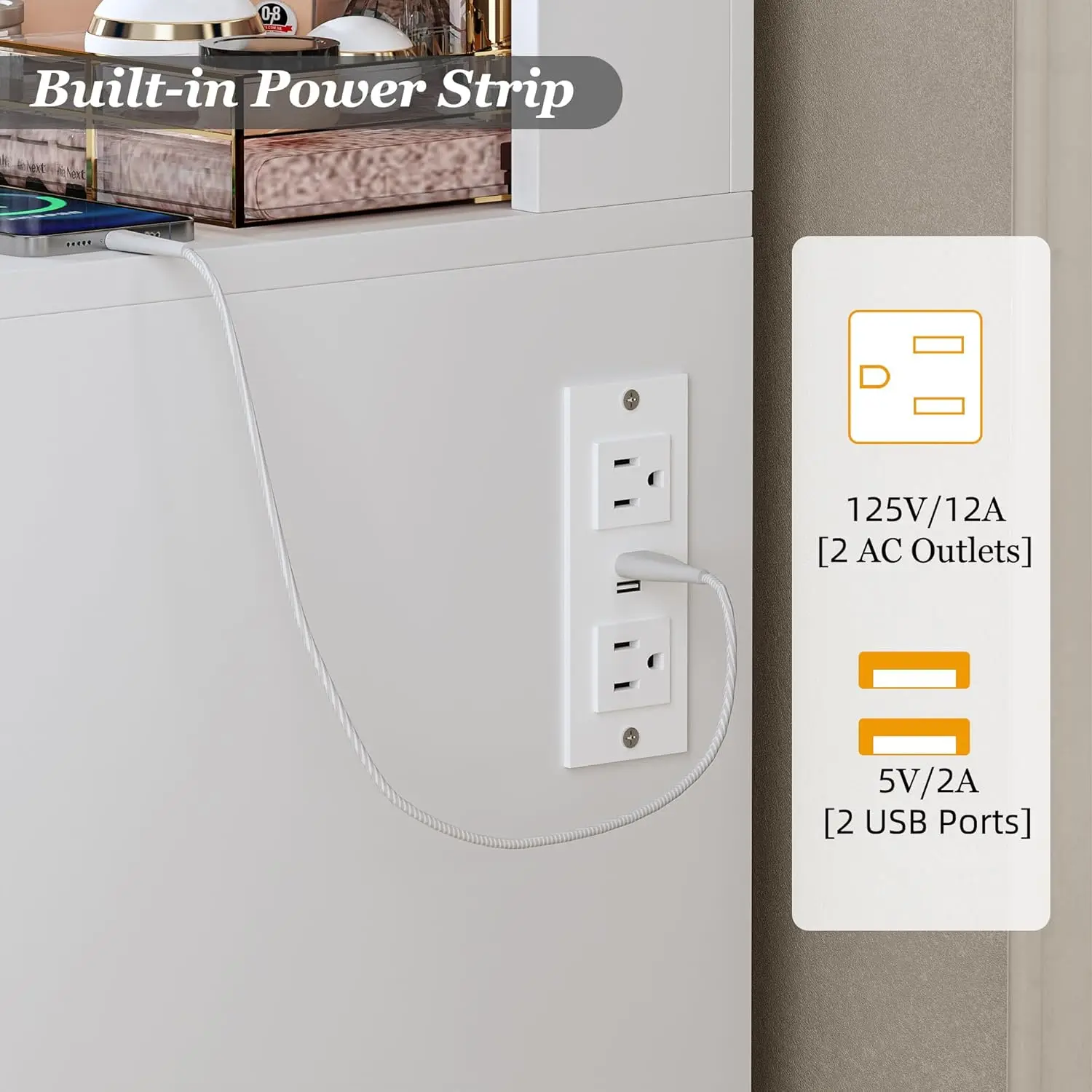 4. Power Outlet & Easy Assembly: White vanity desk with a power outlet, which provide power for your hair dryer, curling iron, and other electronic devices at the same time. Bringing more convenience to your daily life. Comes with tools and numbered accessories, vanity desk with lights very easy to assemble following the step-by-step instructions