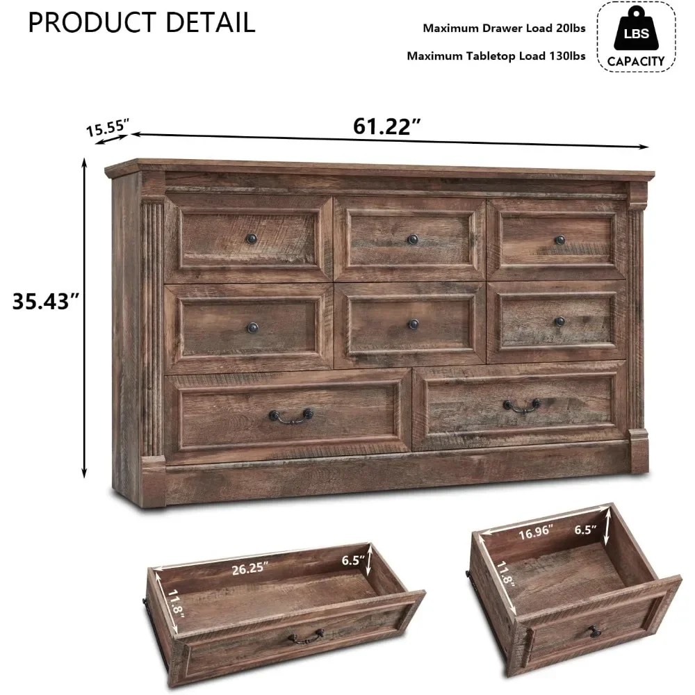 8 Drawers Dresser for Bedroom, 61" Wide Dressers & Chests of Drawers w/Roman Column Two Different Drawer Sizes for Bedroom