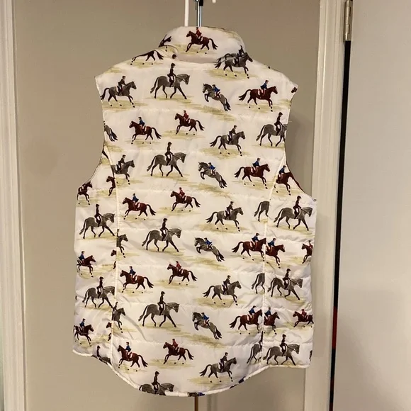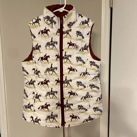 Like new! Ariat Bella Equestrian Reversible Insulated Vest, size XL girls. White with brown horse design, burgundy reverse color. Pit to pit 18” length 22”. AriatTEK® is designed for optimal comfort in any weatherWind and water resistant construction with a breathable designPFC-free EcoDry™ finish repels waterCool Climate Insulation™ for lightweight warmthPrint reverses to solidStand collarHand pockets