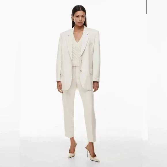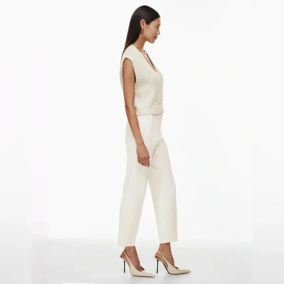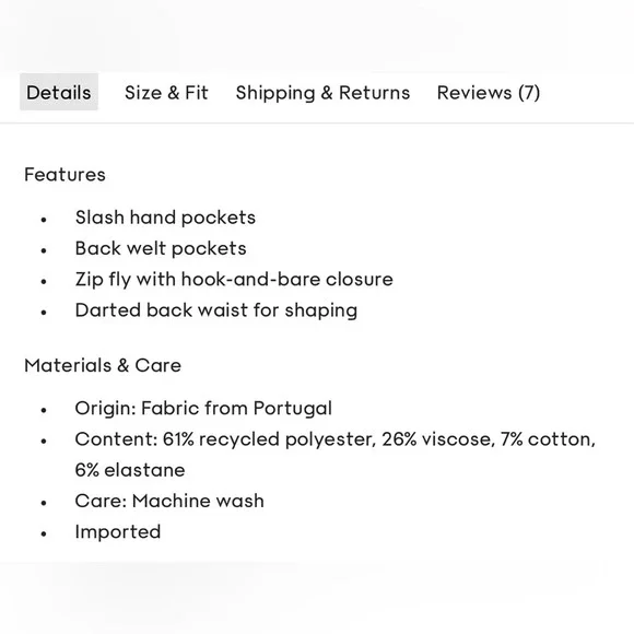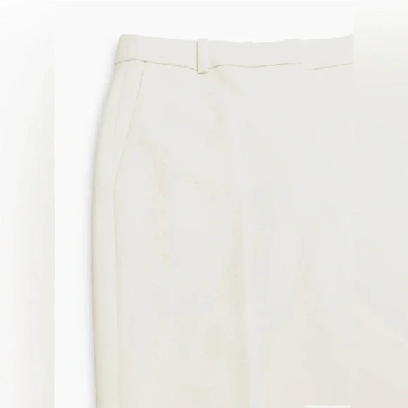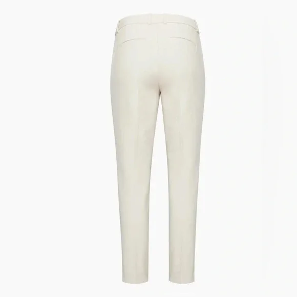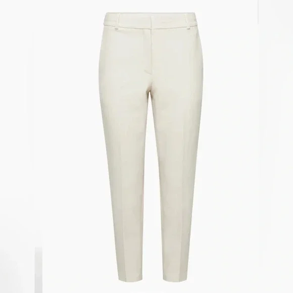 Only worn once.These are mid-rise flat-front pants with a slim fit and straight leg. They’re cut from (Re)ssential — softly structured stretch fabric that holds its form while you move easy. This fabric is sourced from a premier Portuguese mill and made with recycled materials and LENZING™ ECOVERO™ Viscose — responsibly sourced, wood-based fibres produced through a process that reduces impact on forests, biodiversity and water supply. FeaturesSlash hand pocketsBack welt pocketsZip fly with hook-and-bare closureDarted back waist for shapingMaterials & CareOrigin: Fabric from PortugalContent: 61% recycled polyester, 26% viscose, 7% cotton, 6% elastaneCare: Machine washImportedRise: MidLeg: StraightLength: Ankle — Intended to hit at the ankleGarment Inseam: Size 4 is 27" — Inseam varies by sizeModel is 5'9.5"/176cm wearing a size 4On average, customers say it fits true to size