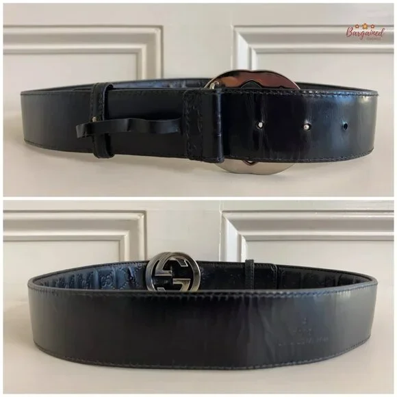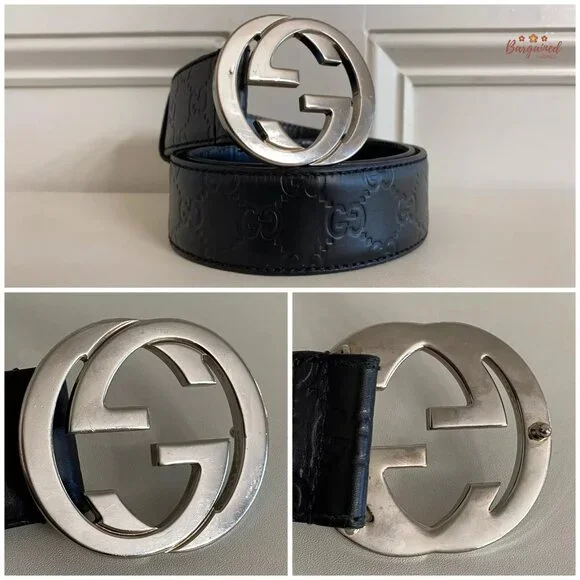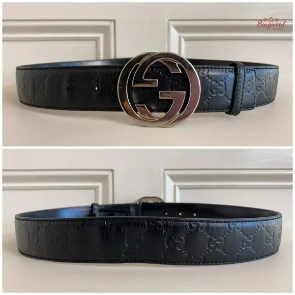 Authentic Gucci Black Monogram Guccissima Leather Silver Buckle Belt 85/34PRODUCT DETAILS:▶Condition is Pre-owned▶Exterior Leather: Minor Wear▶Underside: Creases▶Hardware: Minor Scratches▶Size: 85/34▶3 Holes ▶Waistline from 33" up to 35"▶Adjustable ▶Closure: Silver Interlocking G Buckle▶Hardware Color: Silvertone ▶Date/Authenticity Code: 114984 - 212956▶Country/Region of Manufacture: Italy▶Dimensions: 40"L x 1.5"W ▶Leather to Leather Length: 37.75"▶Reference Number: 011025-0170RB103