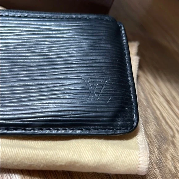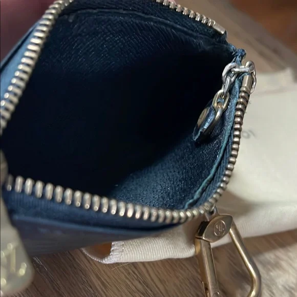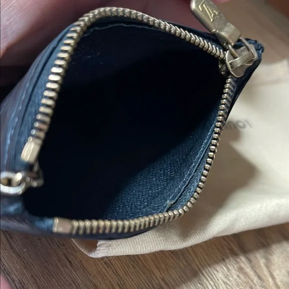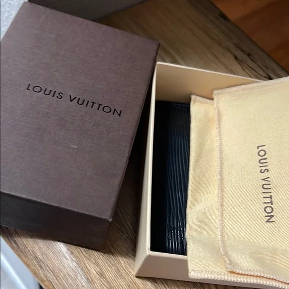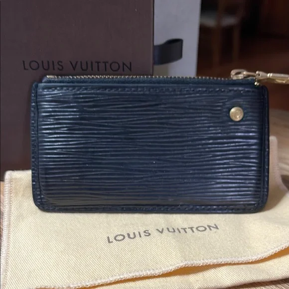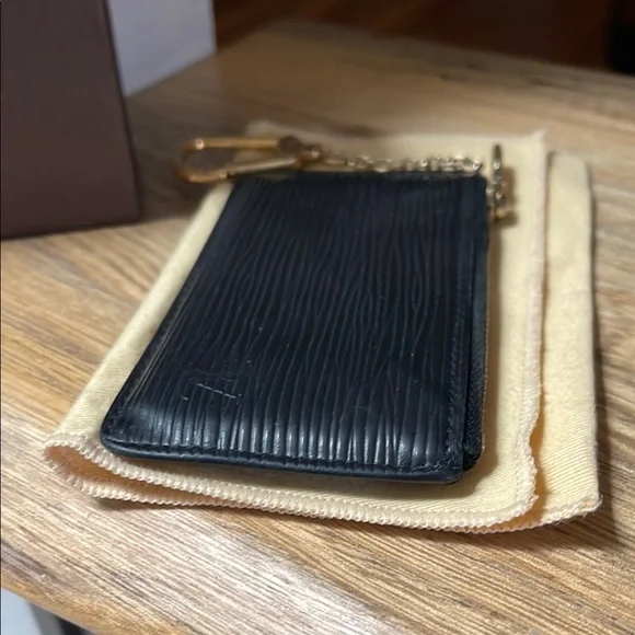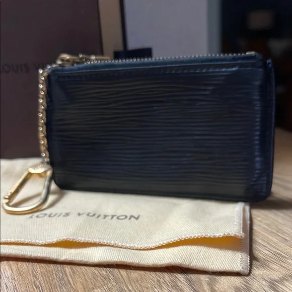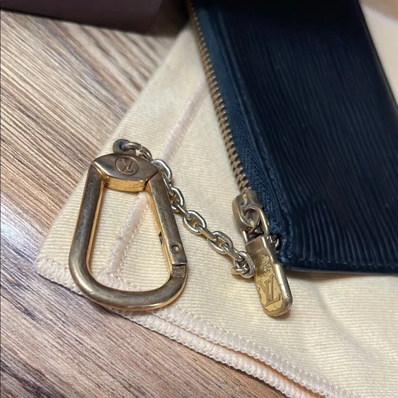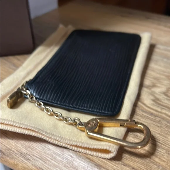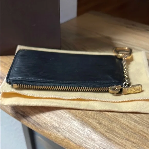 Good Condition 💯 Authentic Louis Vuitton Sleek black key holder with a gold chain. Ideal for stylish key organization.This holds your money and keysThere are scratches, tarnishing & rubbingInside is decent condition, but there are marks and rubbing as well…The code and stamping are faded inside Comes with Louis Vuitton box and Louis Vuitton dust bag Bundle and save