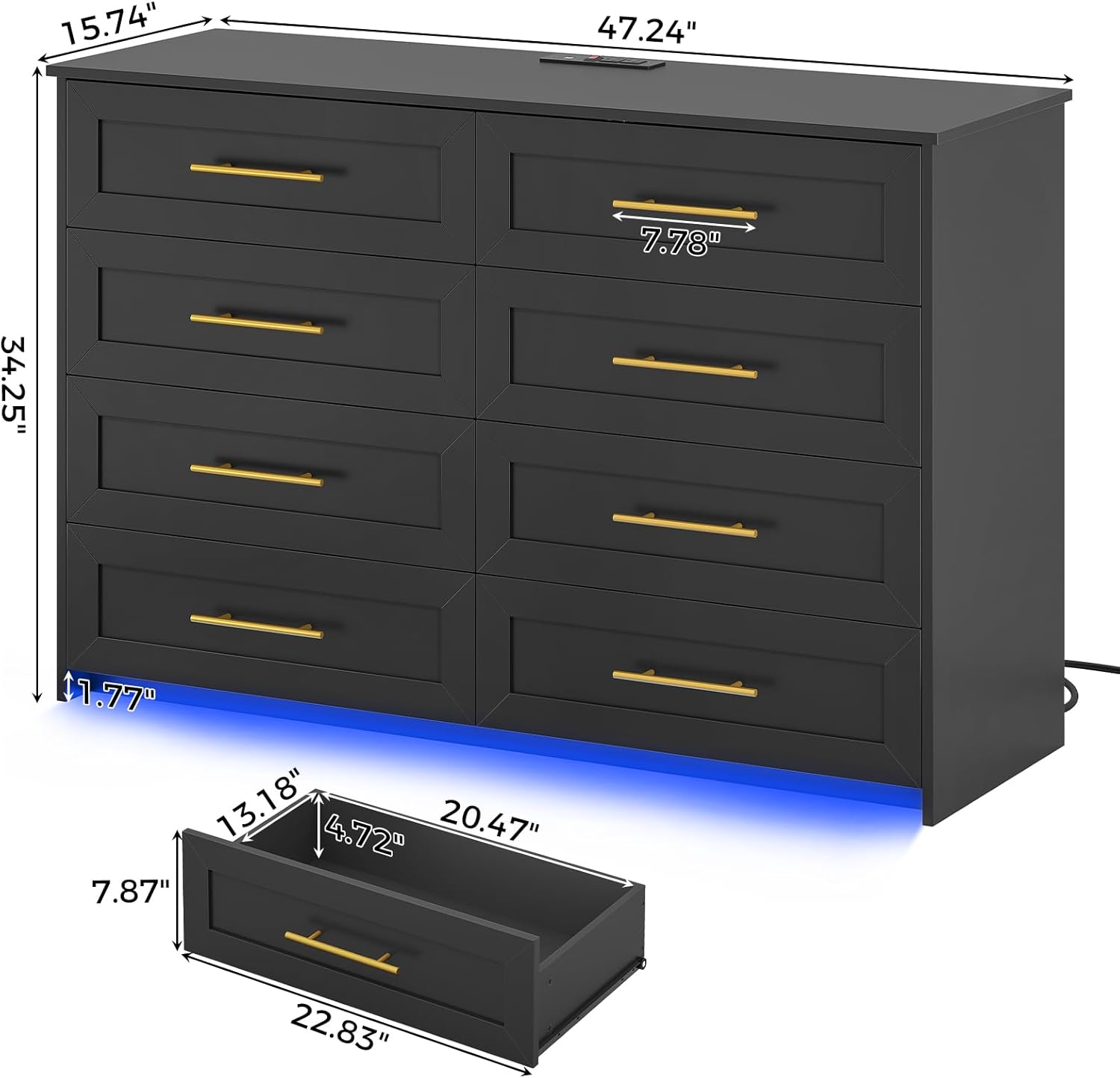 Black Dresser With Charging Station & Open Storage Space, 8 Drawer Dresser With Led Lights For Bedroom, Modern Wide Chest Of