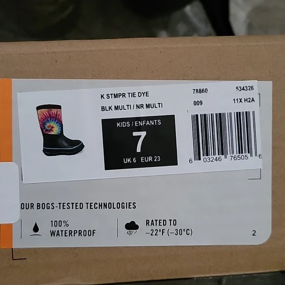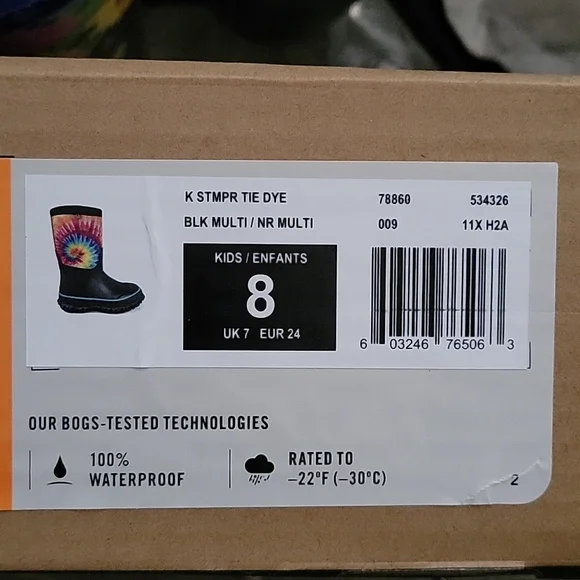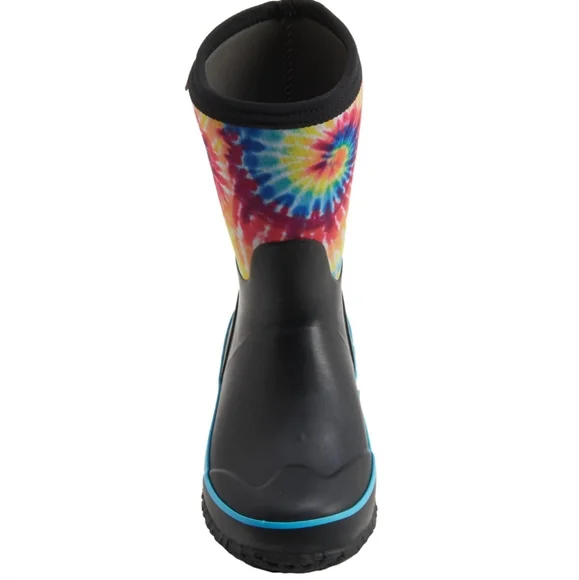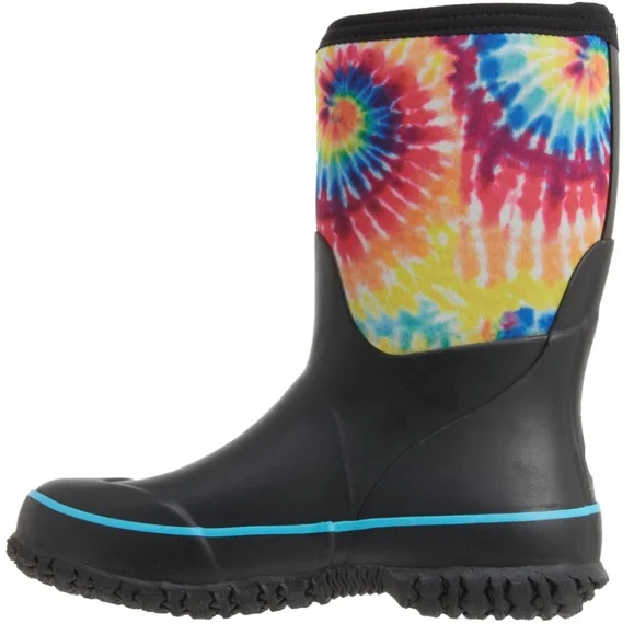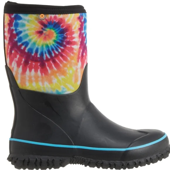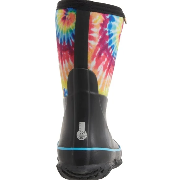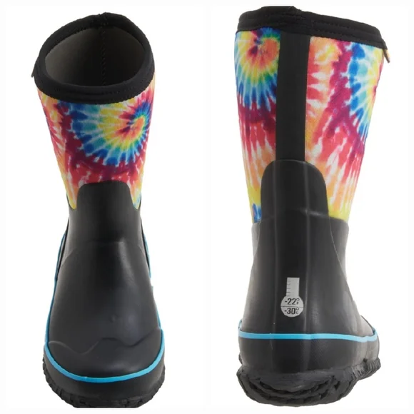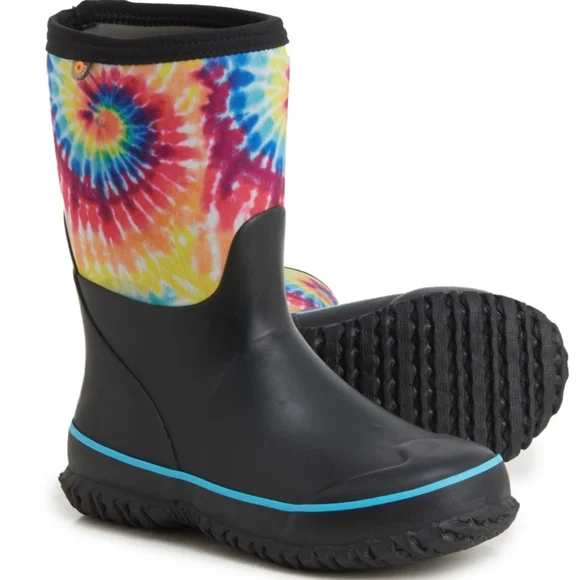 Bogs Kids Classic Stomper Neoprene Tie Dye Boots Pull On StyleFull rubber foot with stretchy neoprene shaft 7 mm Neo Tech insulation Cushioned Soft, stretchy collar Soft, moist-wicking fabric lining AEGIS microbe shield antimicrobial treatment Durable grippy synthetic rubber outsole100% Waterproof Rated -22° FNEW in BoxSnow, Rain, Muck Boots, Mud, Corral, Outdoor, Adventure, Equestrian, Farmhouse
