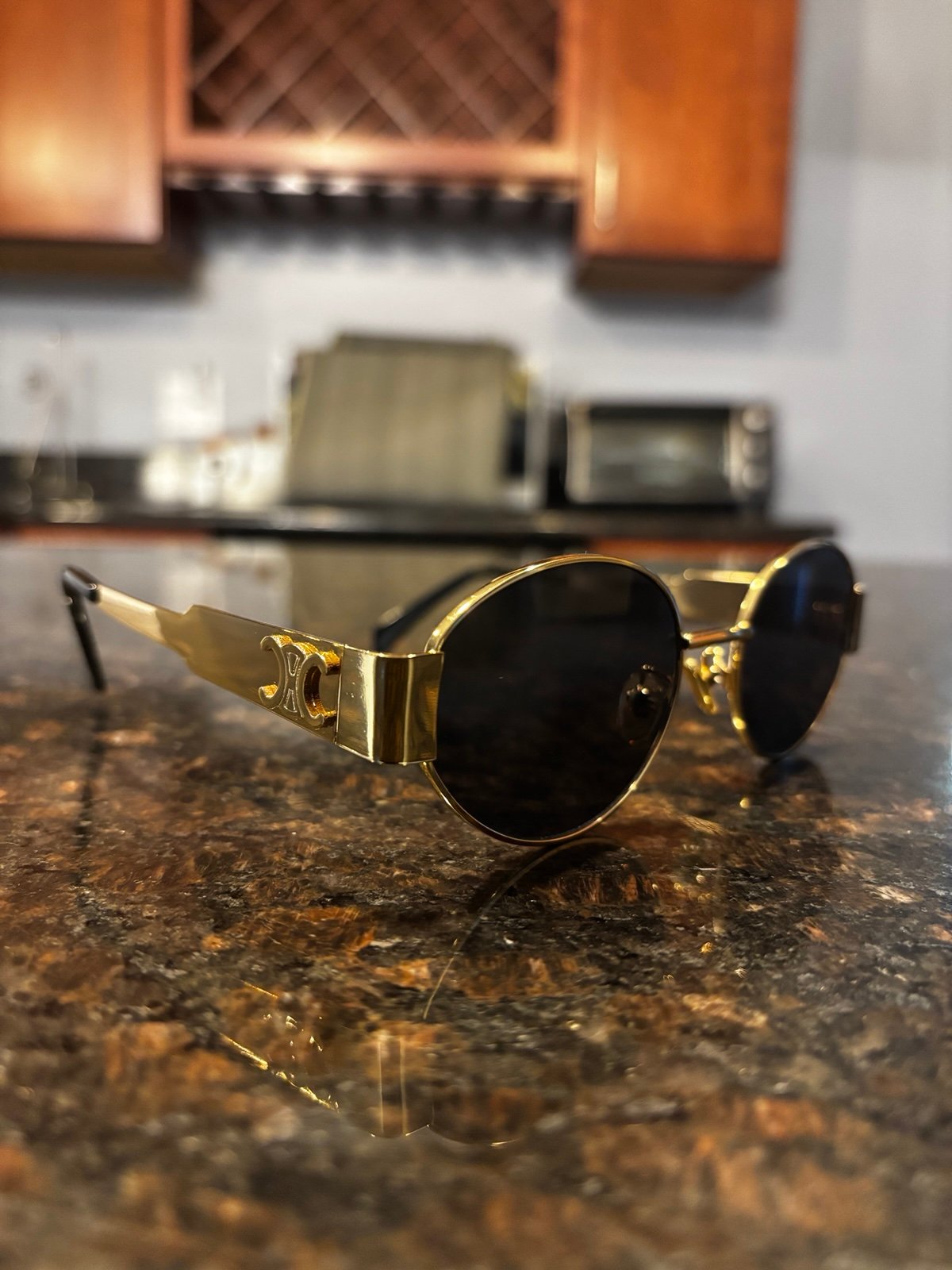 Authentic Celine Triomphe sunglasses—gold metal round frames, black arms, and grey lenses. Triomphe logo on each arm, Celine logo etched on lens. Minimal wear, flawless condition. Set includes Celine case, box, and cloth. All photos show actual item. Ships fast, always authentic. Offers and questions welcome!