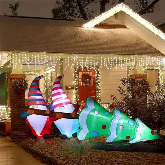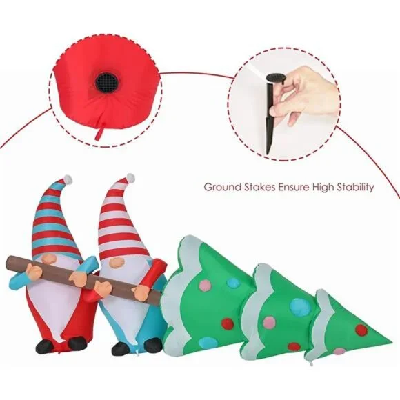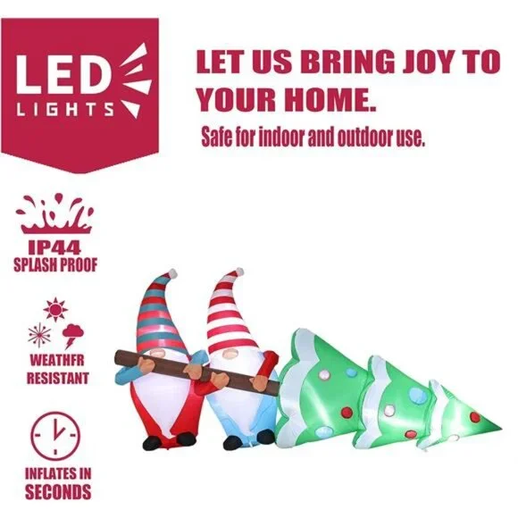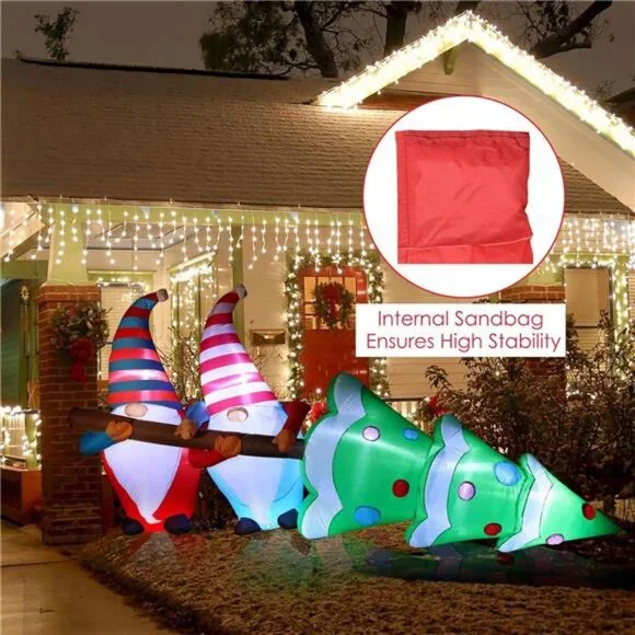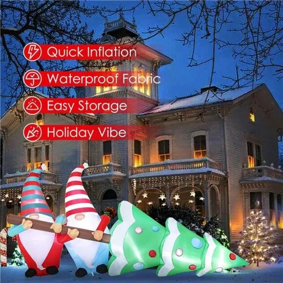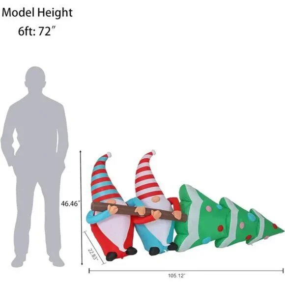 🧿Charming Aesthetic: The illuminated Gnome Christmas Inflatables outdoor decorations feature integrated LED lighting, casting a warm glow over your yard, garden, and patio, transforming the entire setting at nighttime. These inflatable Christmas yard ornaments not only usher in a delightful holiday ambiance for you and your loved ones but also hold the power to captivate the attention of your neighbors and visitors.🧿High Quality: Crafted from robust weather-resistant polyester, the inflatable outdoor Christmas decorations yard gnome elves with tree boasts exceptional durability, shielding it from potential rips and tears. The meticulous stitching further enhances the longevity of this decorative inflatable. You can place and pop up the Christmas outdoor decor you want in a minute without any concern about the quality. We use high-quality lights to ensure long-lasting use.🧿Usage Scenario: The measurements of the Christmas blow ups outdoor decor extend to around 22.83" x 105.12" x 46.46". Delight in the charming spectacle of the exuberant gnome characters dressed in elf attire, merrily conveying an inflatable Christmas tree to grace your yard. As night falls, these friendly Yuletide comrades come to life, casting a vibrant and animated display that enlivens your outdoor surroundings.