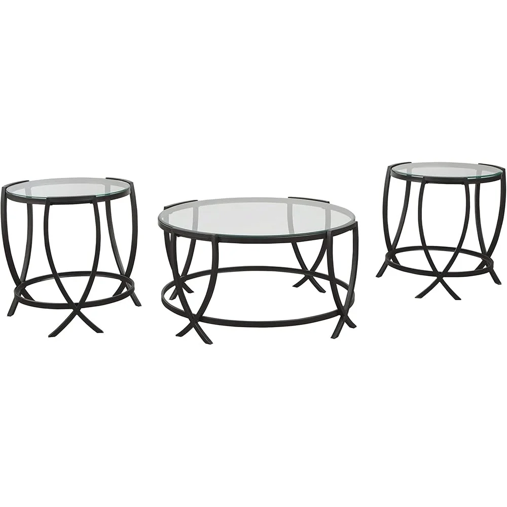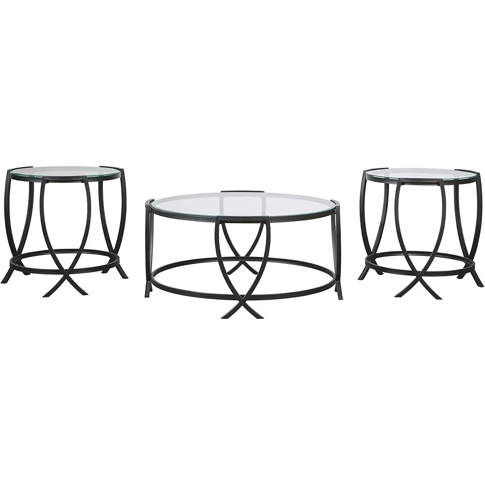 About this item OCCASIONAL TABLE SET: Making a brilliant impression with its metal arc X-motif, this coffee table set is sure to round out your space with fashionable flair CONTEMPORARY DESIGN: Casual contemporary styling. Thin line metal arc x-motif leg design in black finish. Top has inset clear tempered glass with beveled edge for a contemporary feel SET OF THREE: This table set includes coffee table and 2 end tables . The round design works well for smaller scale furniture and spaces PERFECTLY SIZED: Coffee table measures 36 W x 36" D x 18" H. End tables measure 22" W x 22" D x 23" H (each) ASSEMBLY REQUIRED: Easy-to-follow instructions, tools and hardware included