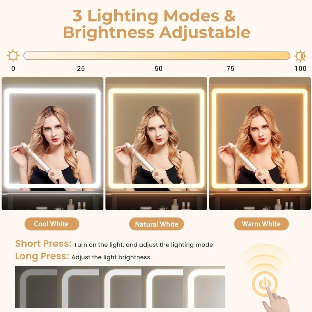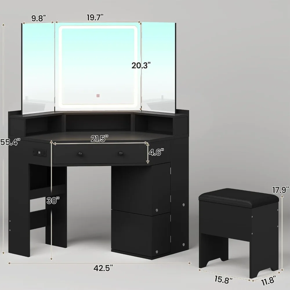 • 【Tri-fold Mirror and Lights】This corner vanity features a tri-fold HD LED mirror. Get the full view from every angle! The tri-fold mirror design ensures you see every detail, helping you achieve perfection every time you get ready.Our energy-efficient LED lights give you the ideal illumination for makeup application and grooming.