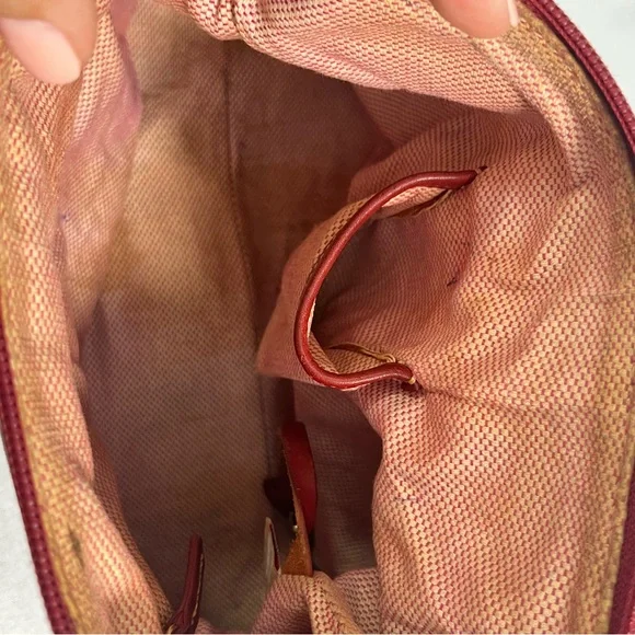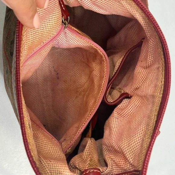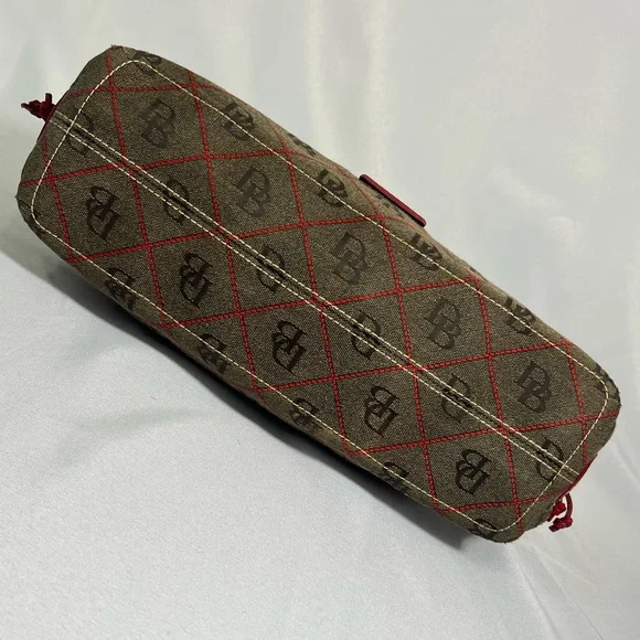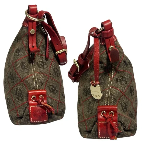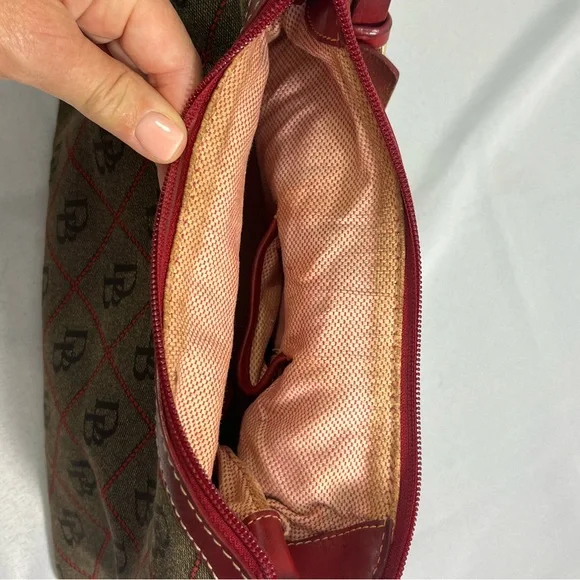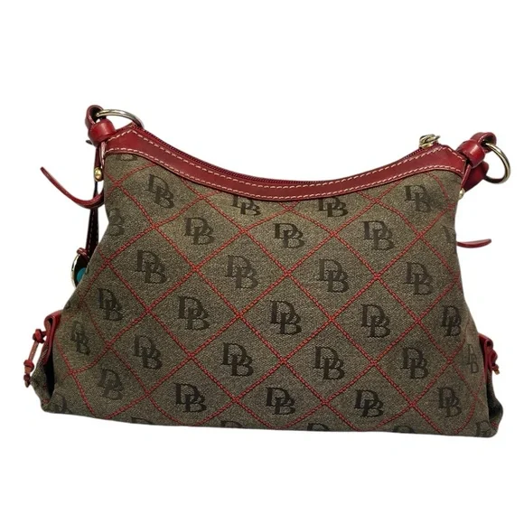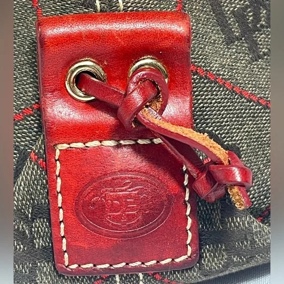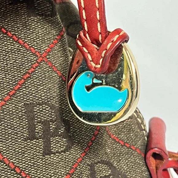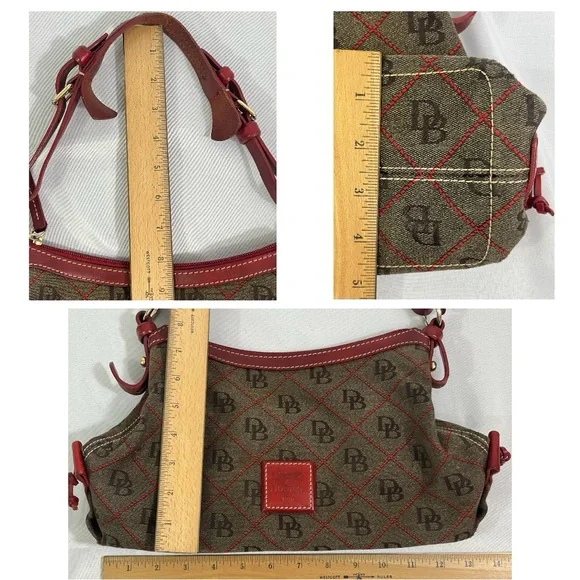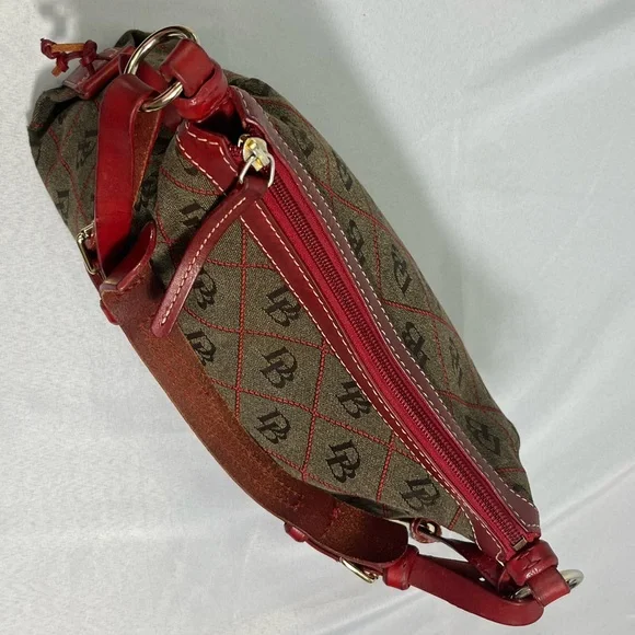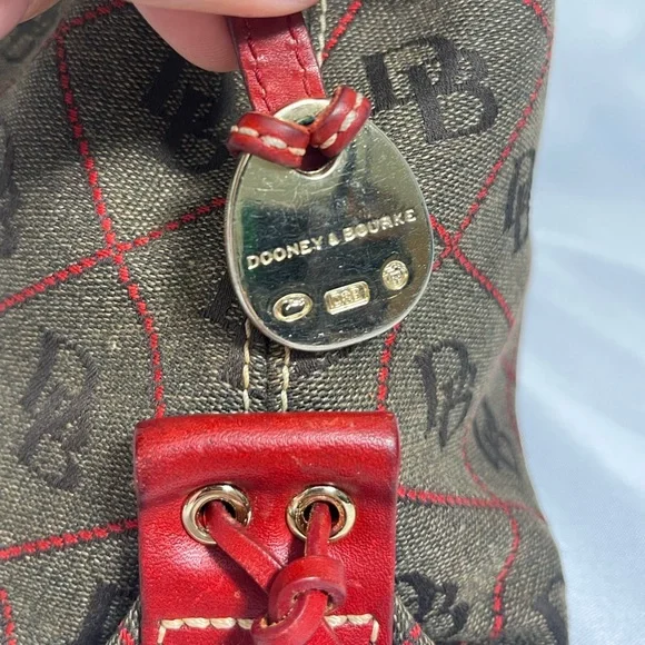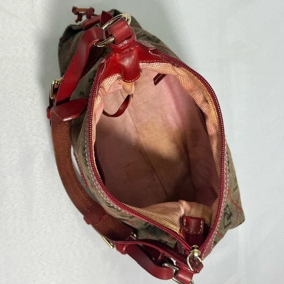 Dooney & Bourke single handle satchel handbagMeasurements: (see photos)13” wide8” tall5” deep8” strap dropDark brown and red jacquard monogram diamond pattern Red leather trimLight tan stitchingGold tone metal hardwareGood condition exterior with very minor bottom panel discoloration Interior lining has many stains, has been carefully washed by hand and could possibly still be improved with some TLCSee all photos, ask any questions