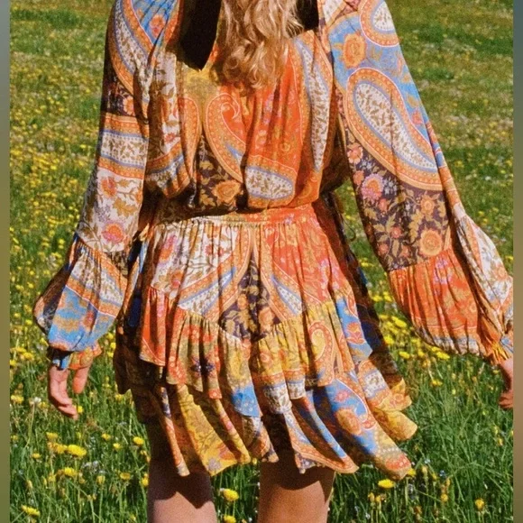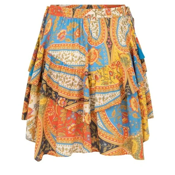 EUC Spell & the Gypsy Collective Kaleidoscope Belladonna Handkerchief Mini SkirtThe Belladonna Handkerchief Mini Skirt in the Kaleidoscope color way is a striking new style for SPELL. Romantic w/ an edgy twist, we see this one paired w/ an oversized Tee & combat boots for a ‘cool-girl’ vibe or pair w/ the matching blouse (SEE IN MY CLOSET), headscarf & chunky pumps for balmy night dancing under a star studded sky.Size: XXX-LargeDetails:Elasticated Waistband w/ Side Seam Drawstrings w/ TasselsGathered TiersHandkerchief Hem w/ Double Frill100% LENZING ECOVERO Viscose Fujet Gentle Cold Hand Wash/Dry CleanableImportedApprox. Measurements:Waist (Relaxed): 36.75”Waist (Stretched): 51.75”Outside Length: 17”Condition: Excellent like new condition. No signs of wear as photographed. See all images and video for overall condition. Smoke free but pet friendly householdSee matching XXXL long sleeve blouse in my closet!J-4