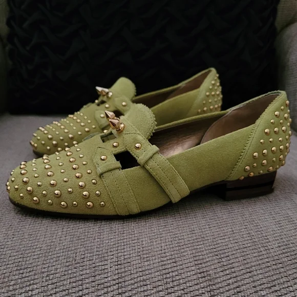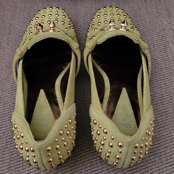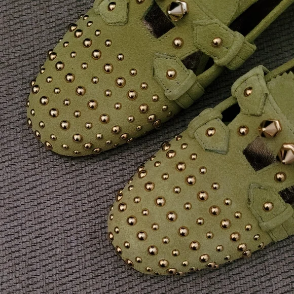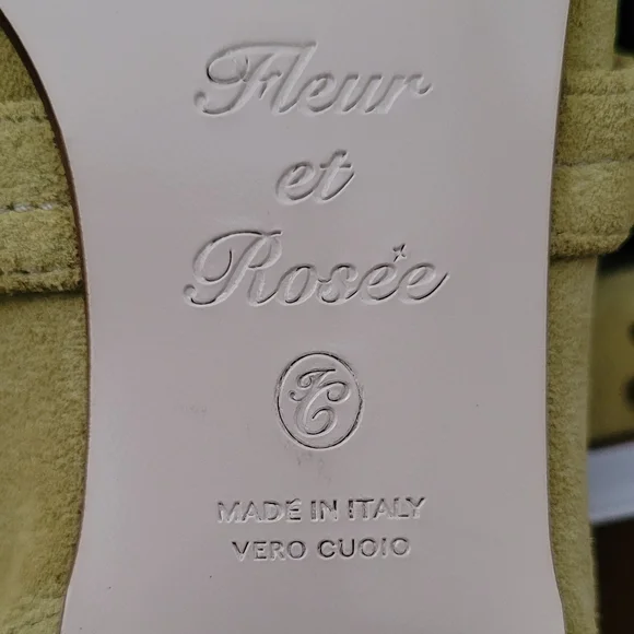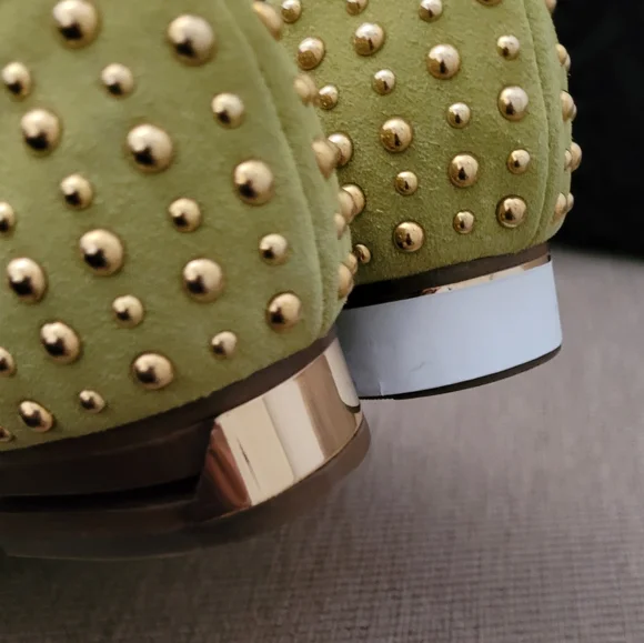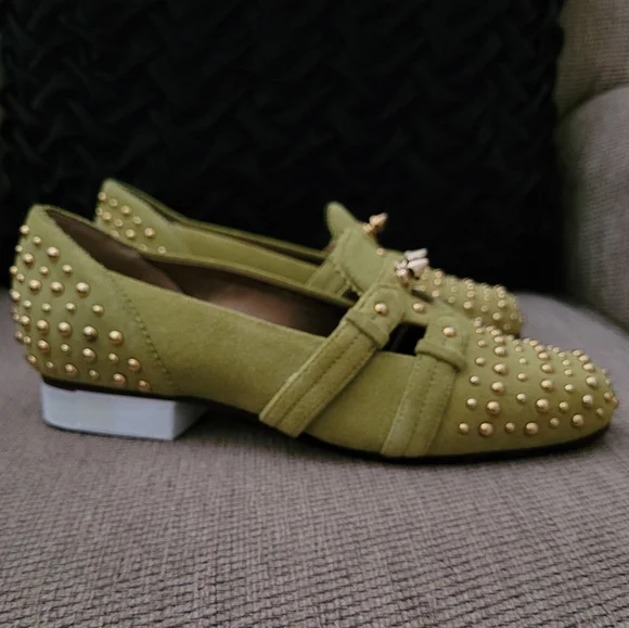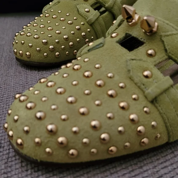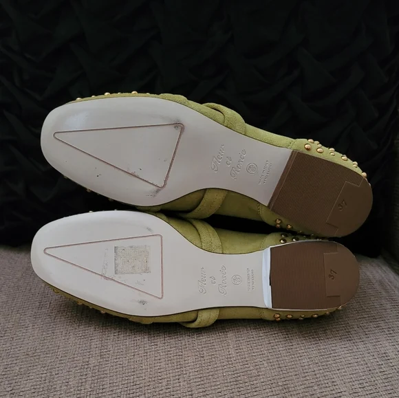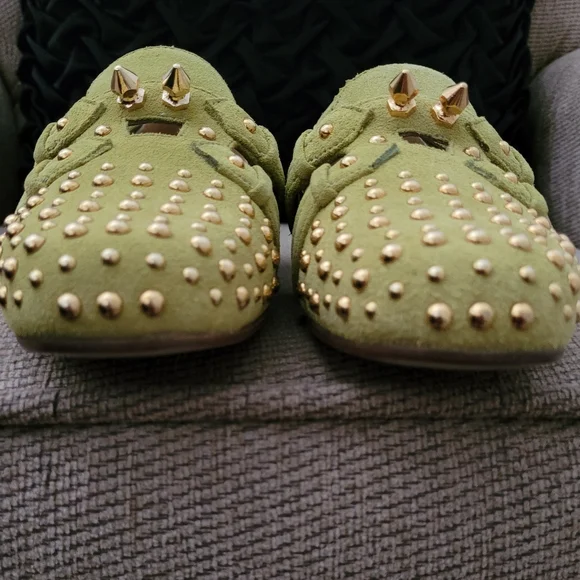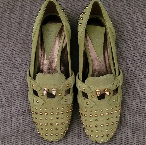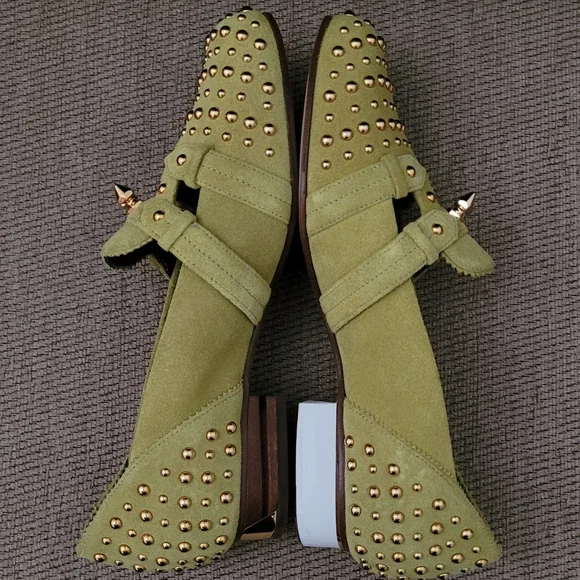 Fleur Et Rosee handcrafted artisan made lime vero cuoio studded loafers. Made inTuscany Italy. Wood and metal heel. Metal studs and buckle embellishments. See last photo for online description and specs. Stamped size 37 which is equivalent to a size 6.5-7 u.s. Never worn. Please see all photos which were taken in natural light.