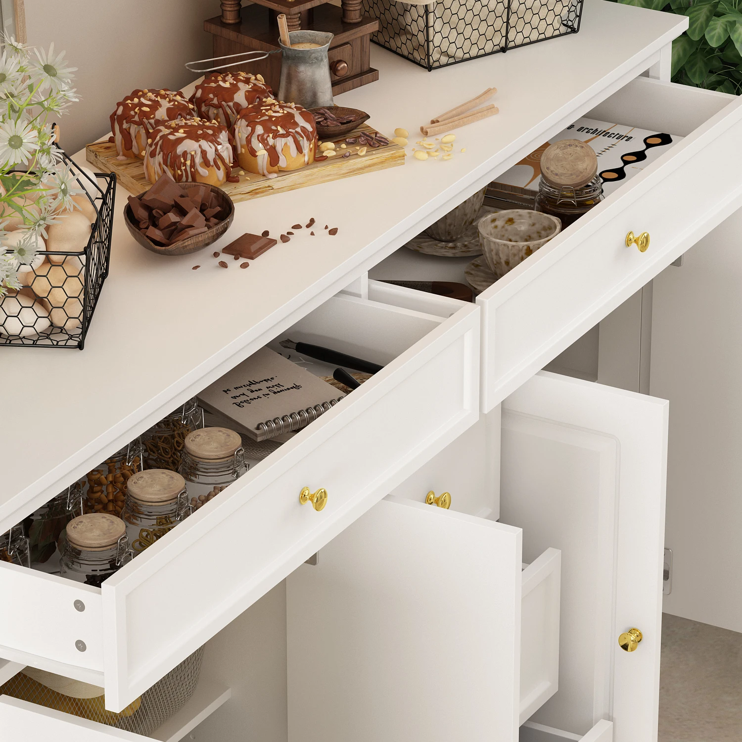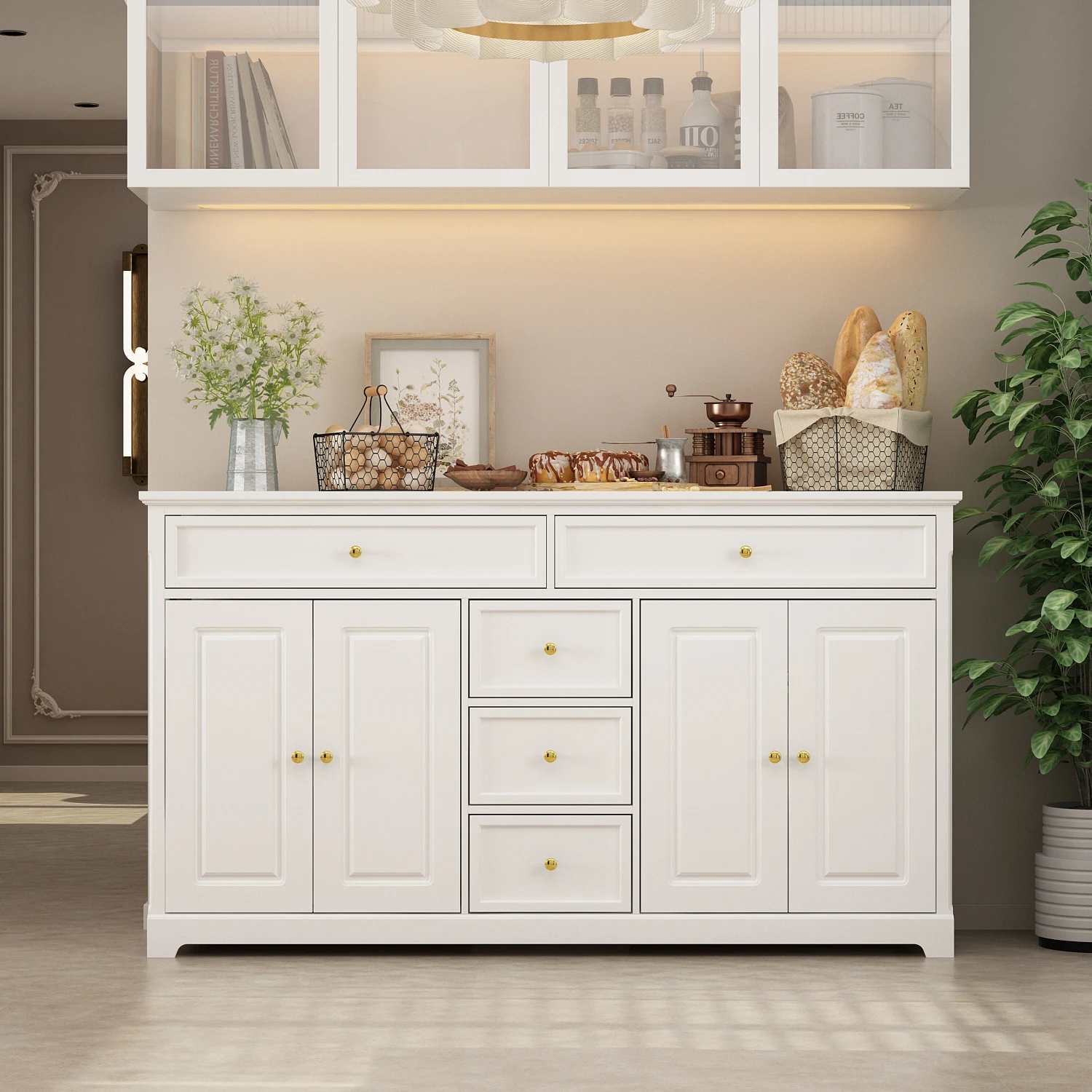 FUFU&GAGA Modern Dresser Cabinet with 5 Drawers & 4 Storage Compartments, Sideboard Cabinet with Adjustable Shelves, White