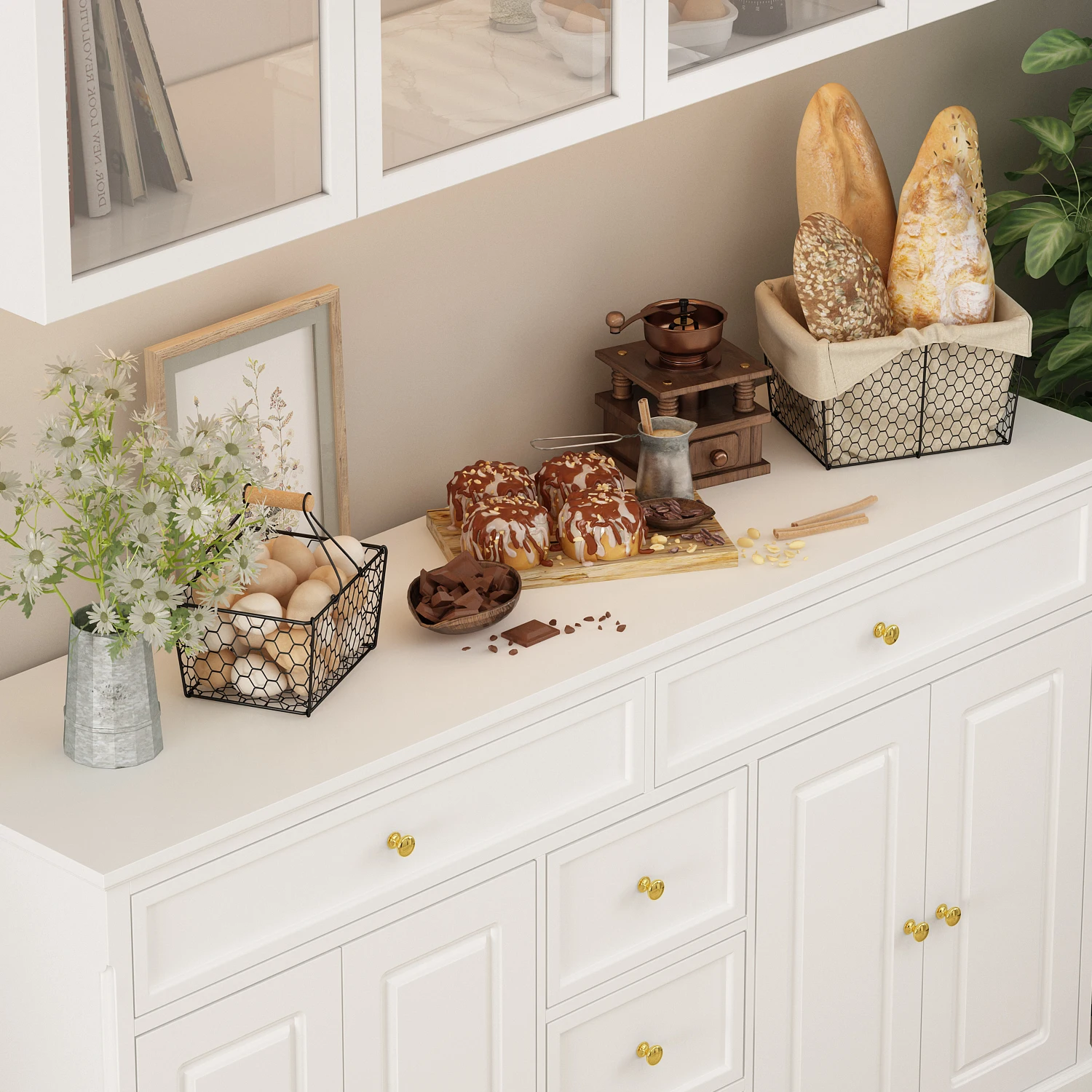 This modern white drawer cabinet is a multifunctional and stylish furniture designed to enhance the functionality and aesthetics of any bedroom or living room. This cabinet has five drawers and four storage compartments, providing ample space for organizing cosmetics, skincare products, and other personal items. Its simple lines and minimalist aesthetics make it an ideal complement to contemporary interior design, both practical and elegant.