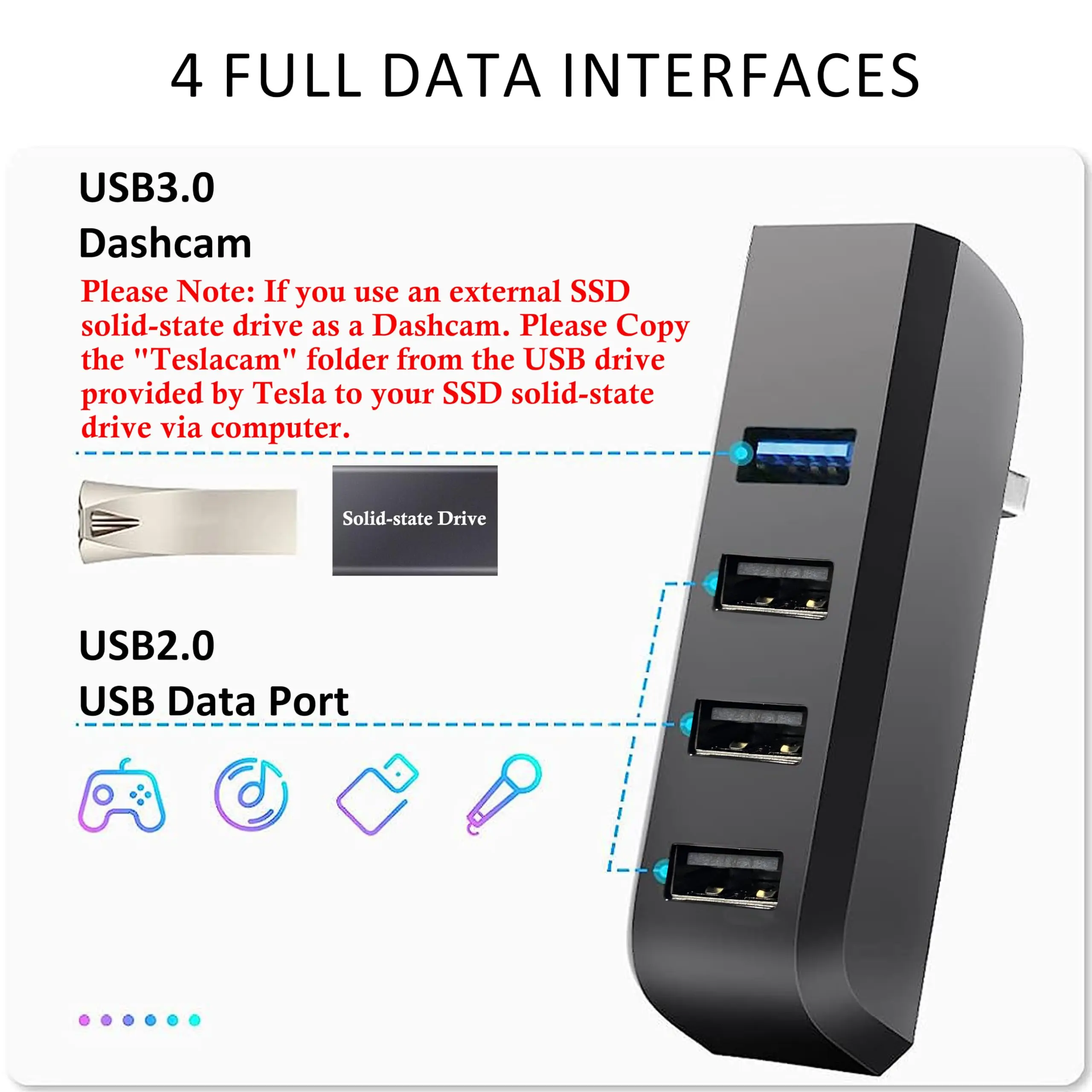 【4-in-1 Multi Ports】Convert the original car from one glove box USB-A port to four USB-A ports. One USB 3.0 port and three USB 2.0 ports. The USB 3.0 blue port is suitable for driving recorders. It is compatible with external Dashcam and supports the use of up to 2TB SSD solid-state drives. The other three 2.0 interfaces are suitable for charging, listening to music, playing games, and flash drives, and can be used simultaneously without worrying about car system alarms.