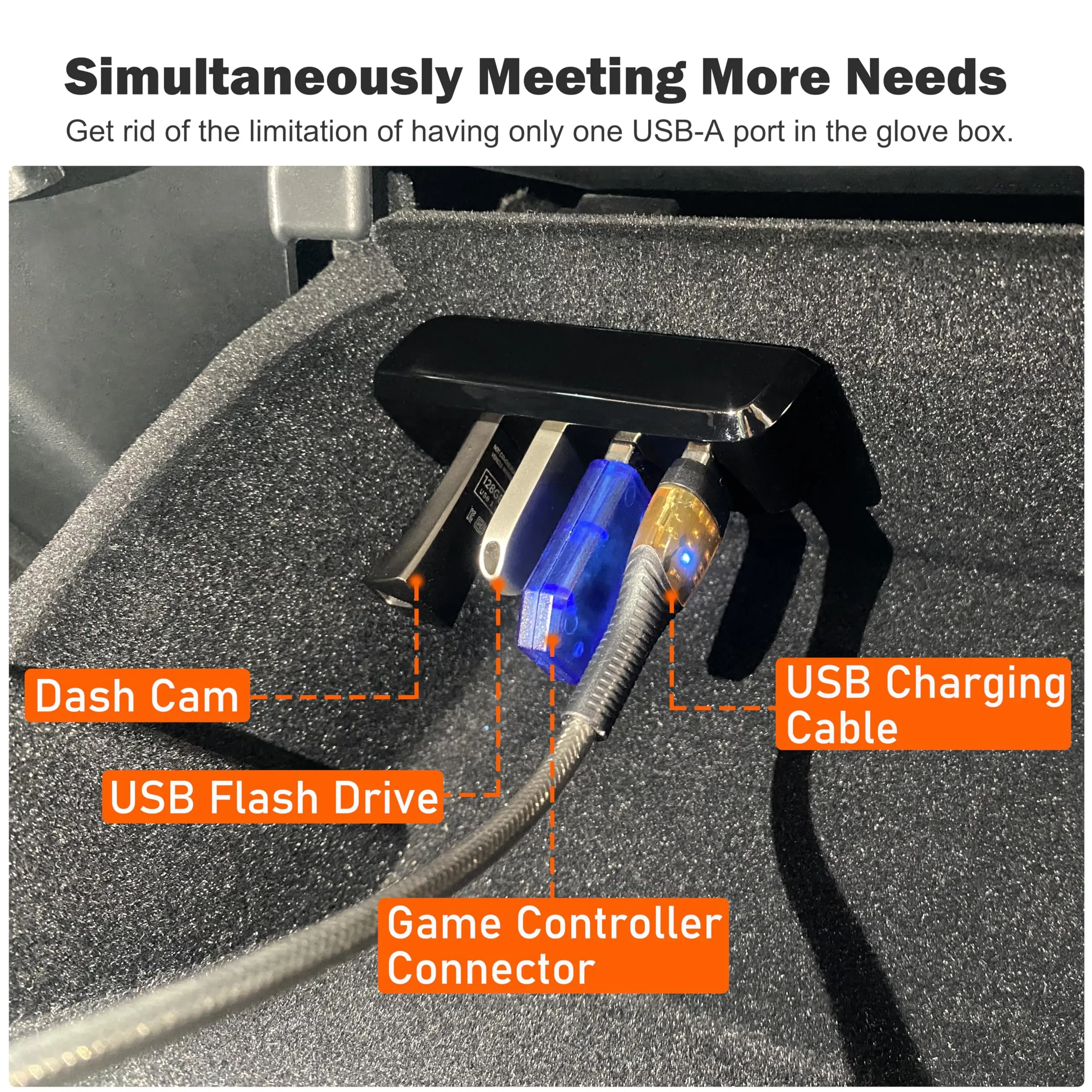 【Multi-function & Never Affect Car Functionality】It can be compatible with most electronic devices on the market for power supply or data transmission. It can connect to dash cam, game controller, USB flash drive, and provide power for various electronic devices such as your phone, tablet, headphones, smartwatch, etc. Meeting the basic application needs of Model 3 and Model Y car owners. And it will not affect the opening and use of the glove box at all.