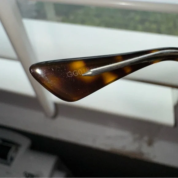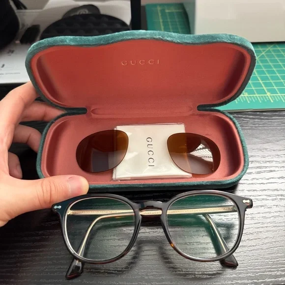 Used Gucci Eyeglasses GG0187O 006 Polished Havana Tortoise and gold Phantos Frame 49 20 145. These are prescription HOWEVER I include brown polarized lenses seen in second photo if you wanted to wear as non prescription as well! Hinge on temple a bit loose and minor scratches. #gucci #eyeglasses #sunglasses #optical
