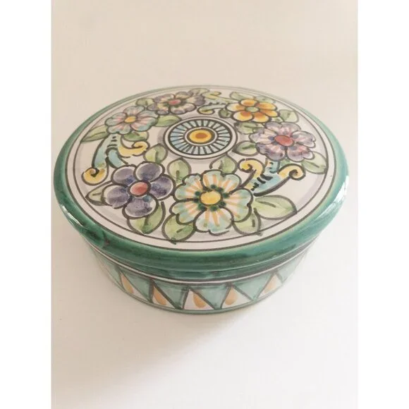 This handmade D'Acunto Vietri ceramic box features a vibrant floral design with intricate detailing. Made in Italy, the round box is perfect for decorative or functional use, showcasing timeless craftsmanship and artistry. Its 6" diameter provides ample storage with a visually appealing, hand-painted finish.• Hand-Painted Floral Design• Durable Ceramic Construction• Removable Lid• Intricate Italian Craftsmanship• 2.5" Depth For Storageshop the rest of my closet for: Beautiful gothic chic cozy hippie free people Anthropologie retro vintage Victorian trending Coachella 70s 80s 90s 2000’s witchy UO doen spell valentine date night iso rare western festival wedding Bachlorette bohemian cottagecore minimalist sexy soft suede 2 4 6 8 10 12 women’s spring summer XS S M L XL Sabrina core Taylor western hippie boho