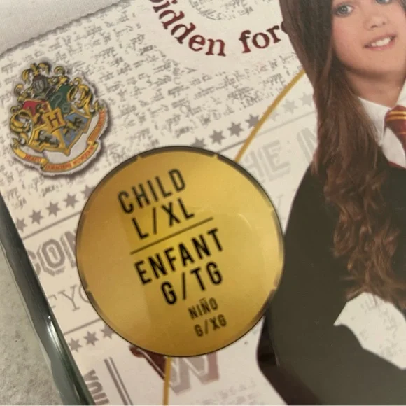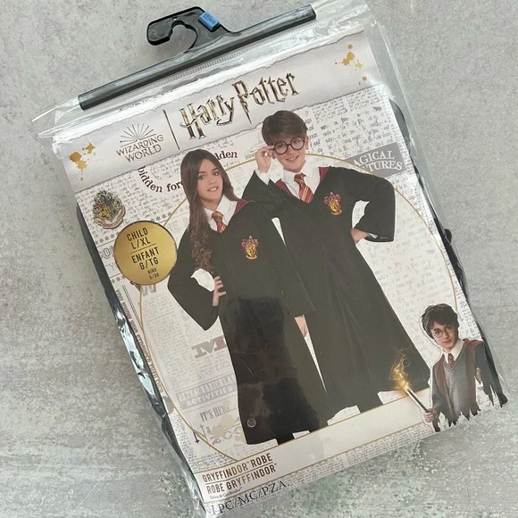 It’s official: you’re now a wizard-in-training at the Hogwarts School of Witchcraft and Wizardry! Dress the part in this unisex hooded robe with Gryffindor crest and matching tie.From the Wizarding World of Harry Potter.Listing Bundle Includes:(1) Hooded Robe:Features Gryffindor crestSatin lined hood Front closure Polyester Size L/XL (14-16)(1) Satin tie Features the red and yellow Gryffindor colors in a diagonal stripe pattern and is adjustable for small to large wizards.3 1/2 in wide x 61 in longPolyester - Very thick fold, good quality material, feels like an actual suit tie!Officially licensed Warner Brothers Harry Potter products.New With Tags, Smoke Free Homeadd some round glasses, white button down shirt, black pants and a wand and your Harry Potter costume will be complete!!!