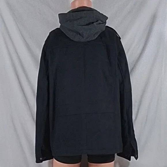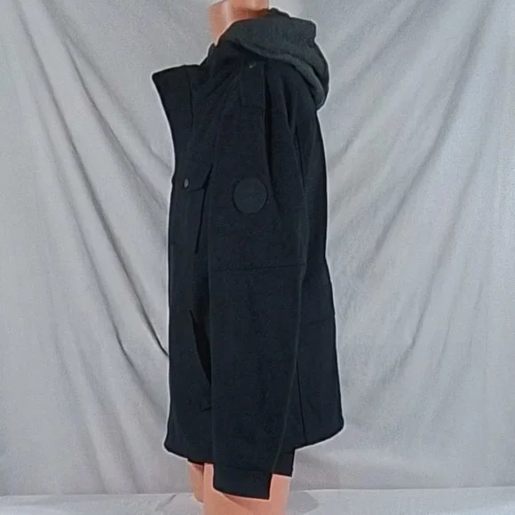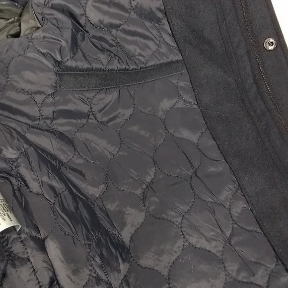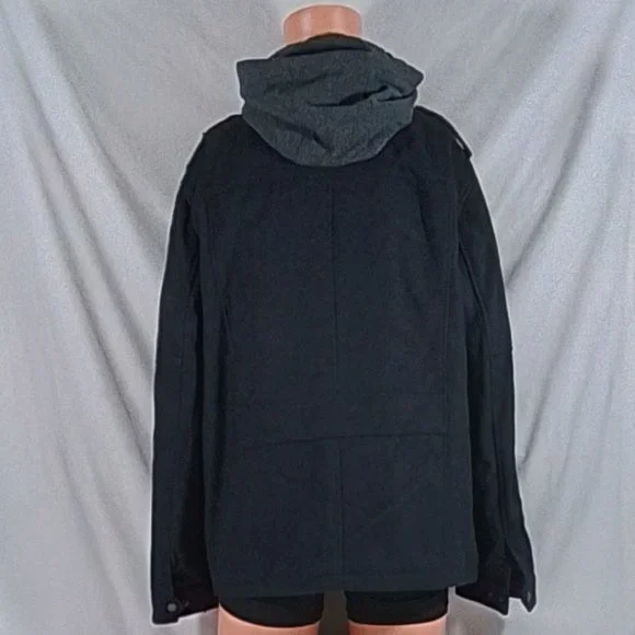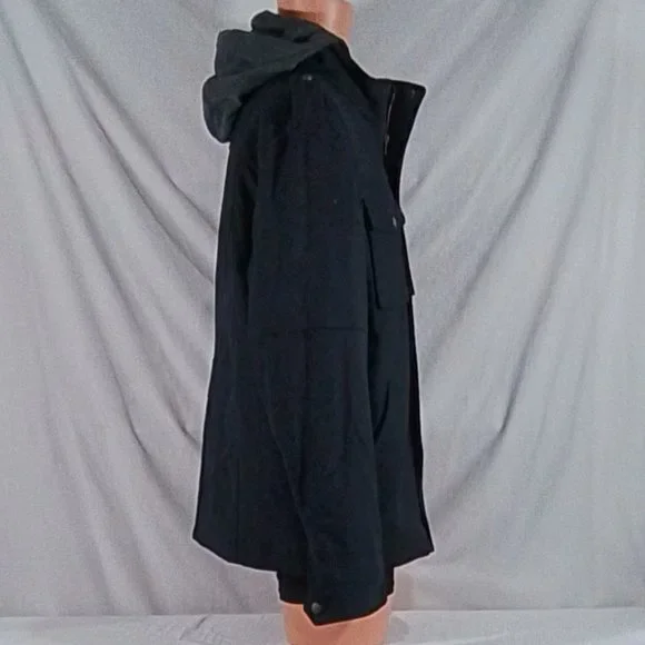 Men's Levi's Wool-Blend Hooded Military Jacket Size: Large Color: Black Classic fit Midweight Front zipper and snap closure Jersey hood with drawstring 2 Side slip pockets, 2 chest pockets with snap closure,1 inside slip pocket Fabric: Shell 70% Polyester 15% Wool 8% Acrylic 4% Rayon, 3% Other fibersHood 59% Cotton 41% Polyester - Body Lining 100% Nylon - Sleeve lining and Filler 100% Polyester Machine washable gentle cycle, tumble dry low Item is New WITHOUT TAGS Photos are of actual item for sale.Color may vary due to photo quality or screen resolution.