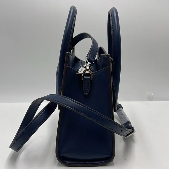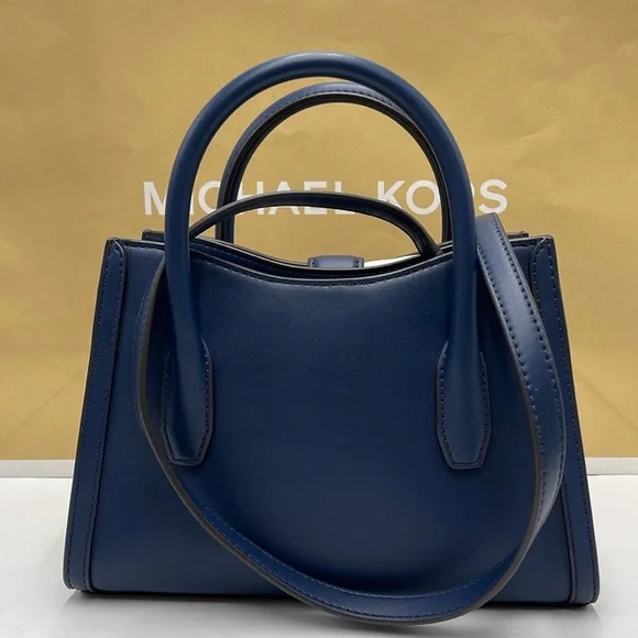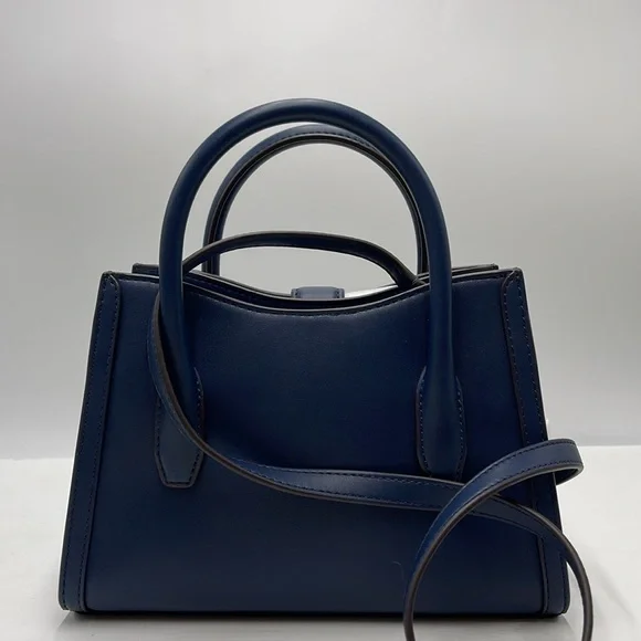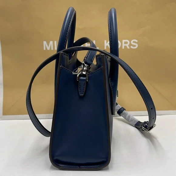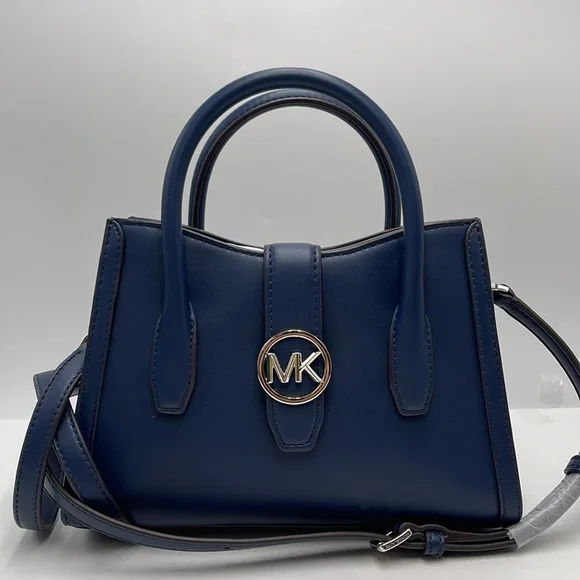 MICHAEL KORSGabby Small Faux Leather SatchelCOLOR NAVYNWT authentic Meet Gabby: a modern take on the satchel. Finished with a gleaming silver-tone logo charm, this classic style feels fresh thanks to a curved top opening and a front flap fastening. A removable shoulder strap lets you go hands-free.• Satchel• Faux leather• 75% polyurethane/20% polyester/3% pigment/2% fibers• Silver-tone hardware• 9.75”W X 7”H X 3.5”D• Handle drop: 3.5”• Exterior details: front slip pocket, removable strap• Interior details: back zip pocket, front slip pocket• Lining: 100% polyester• Zip fastening• Imported• Style # 35S3S5GS5O