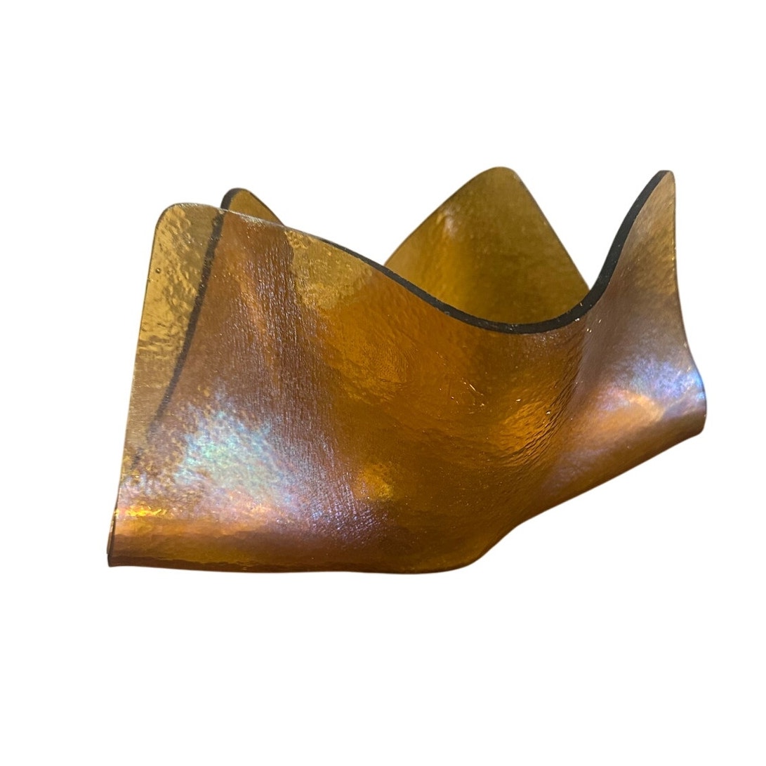 This is a beautiful, handmade fused glass piece that can be used as a votive candle holder, a small vase, or a stunning centerpiece. The unique design and vibrant colors of the glass make it a one-of-a-kind decorative item.