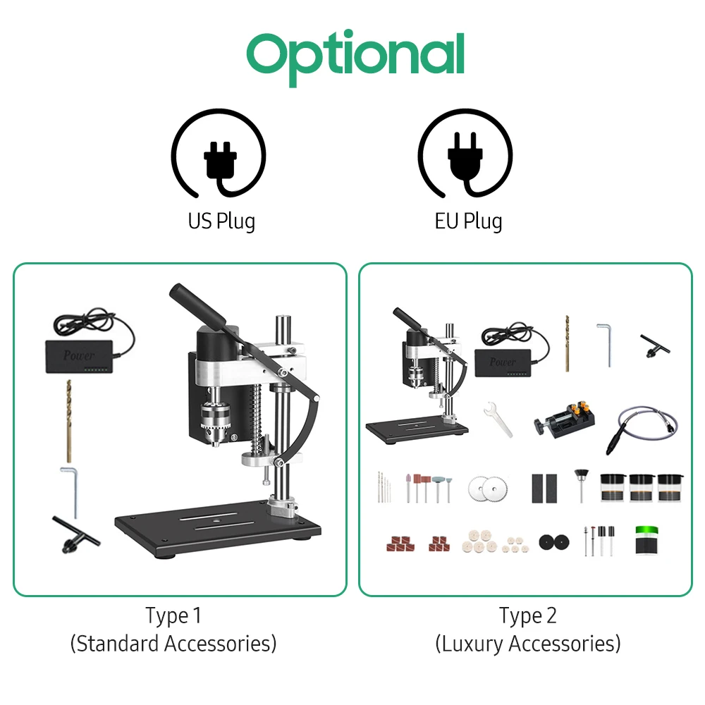 Type 1 includes a bench drill, a power adapter, a 2mm cobaltic drill bit, a 4mm hex L-shaped wrench, and a collet wrench; except for these, type 2 also includes a vice spanner, a vise, a flexible extension rod, 5 drill bits (0.8-3mm), 5 sanding heads, 2 saw blades, 2 whetstones, 1 steel wire brush, 108 sanding bands, 10 sanding bands, 10 wool discs, 2 double-mesh cutting blades, 4 connecting rods, a can of abrasive paste, and 36 resin cutting blades.