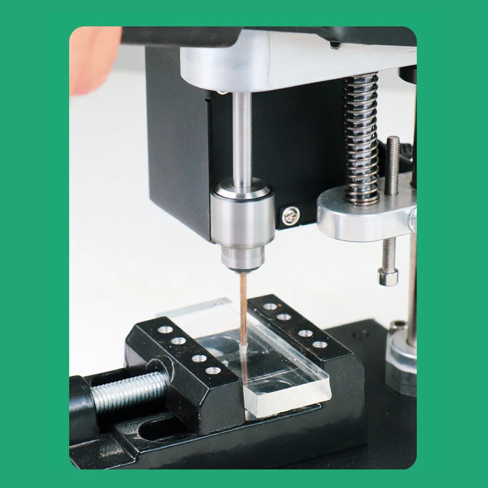 Thickened steel spindle combines with large metal base with non-slip pad to allow high stability in drilling process.