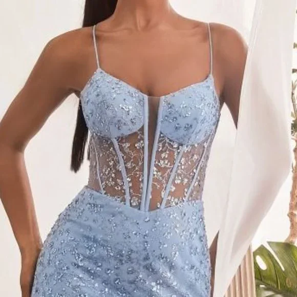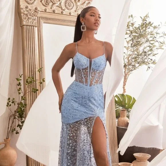 Introducing our breathtaking Long Sheath Dress, a sensational piece of artistry and style that showcases your elegance and leaves a lasting impression. This dress is designed for those seeking the perfect balance between modern sophistication and timeless allure, making it ideal for a wide range of occasions.Length: LongColor: Smoky blueNeckline: Illusion plungingSilhouette: SheathSleeve: Sleeveless, strapsBack: ZipperSkirt: Leg slitEmbellishments: Glitter floral printOccasion: Romantic date/evening/dinner, wedding/bridesmaid, graduation, fashion show, visiting theater/museum/restaurant, banquet, photo shoot, concert, ball gownTAGS: ILLUSION PLUNGING NECKLINE SEMI-OPEN BACK DRESS, LONG SHEATH DRESS, PLUS SIZE PROM DRESS, SLEEVELESS EVENING DRESS FOR SPECIAL OCCASION, HOLIDAYS, WEEKENDS, PARTY, BRIDESMAID WEDDING, MODERN DRESS, SUPERB, CHIC, FESTIVE, EVENING, GORGEOUS DRESS, FLOOR LENGTH SKIRT WITH SLIT, LONG PROM DRESS, GLAMOROUS DRESS, LUXURY DRESS, FASHIONABLE DRESS, EMBELLISHED DRESS, A DELIGHTFUL DRESS, MAXI DRESS FOR FORMAL OCCASION