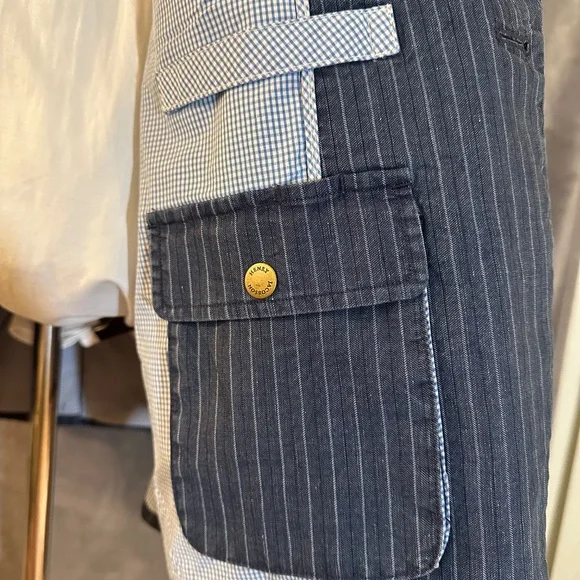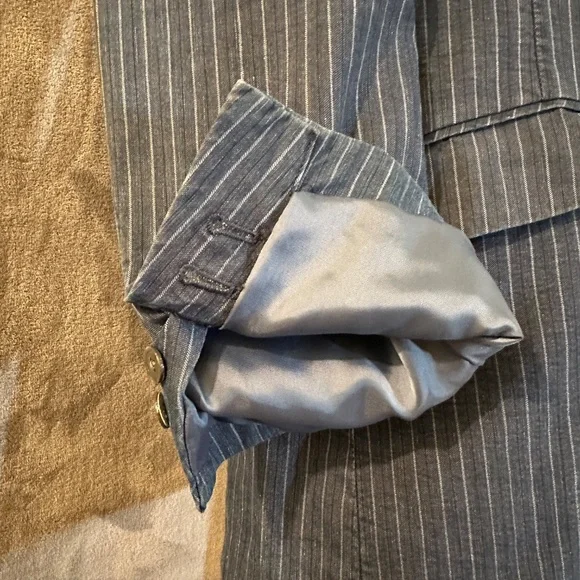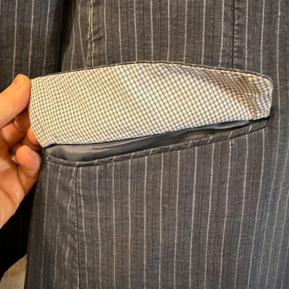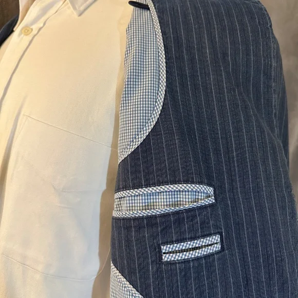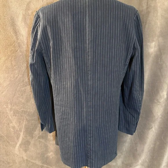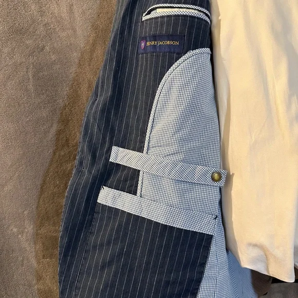 Henry Jacobson Kaihara indigo pin-striped cotton 2-button unconstructed sport coat with slash entry pockets, fully finished interior seams, working button cuffs, Corozo buttons and functional interior pockets including zippered security pocket, journal pocket and smart phone accessories system. Original item tag. Original price: $395