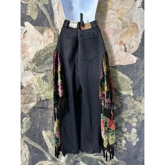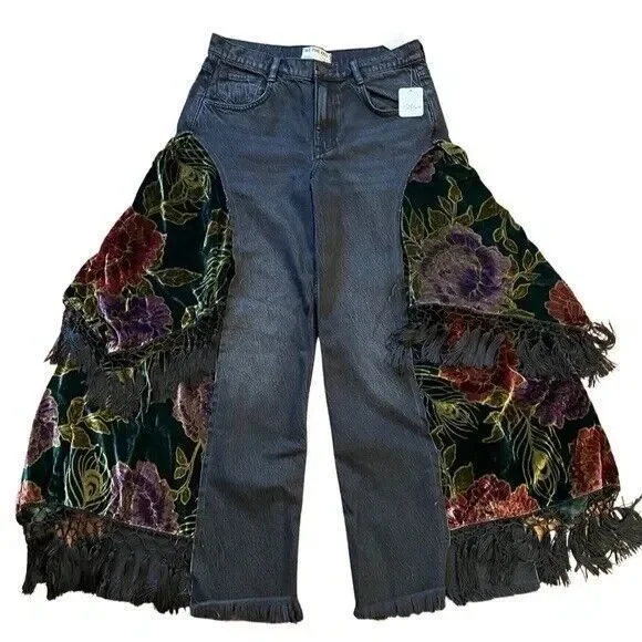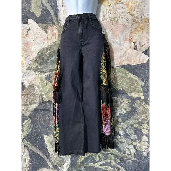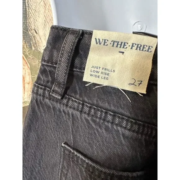 New Free People X We The Free Just Frills Low-Rise Wide-Leg Jeans Size 27Style No. 78946811; Color Code:So cool and a true only-at-FP style, these statement-making jeans from our We The Free collection are sure to stun with every wear.Fit: Mid-rise, wide-leg silhouetteFeatures: Zip fly and button closure, five-pocket design, velvet piecing at the sides, fringe tassel trimmingWhy We <3 It: The perfect way to command a room, these jeans pair perfectly with sleek heels or platform loafers for endless ways to wear.We The FreeHeritage inspired and lived-in staples. We The Free is an in-house label.Care/ImportMachine Wash ColdImportMeasurements for size 28Waist: 33 inHips: 39.75 inRise: 10.625 inInseam: 29 inContents74% Cotton, 26% ViscoseTrim: 75% Viscose, 25% NylonBrand new items100% AuthenticLine through Name tags (Inside tag) only done to prevent store returnBR-A4