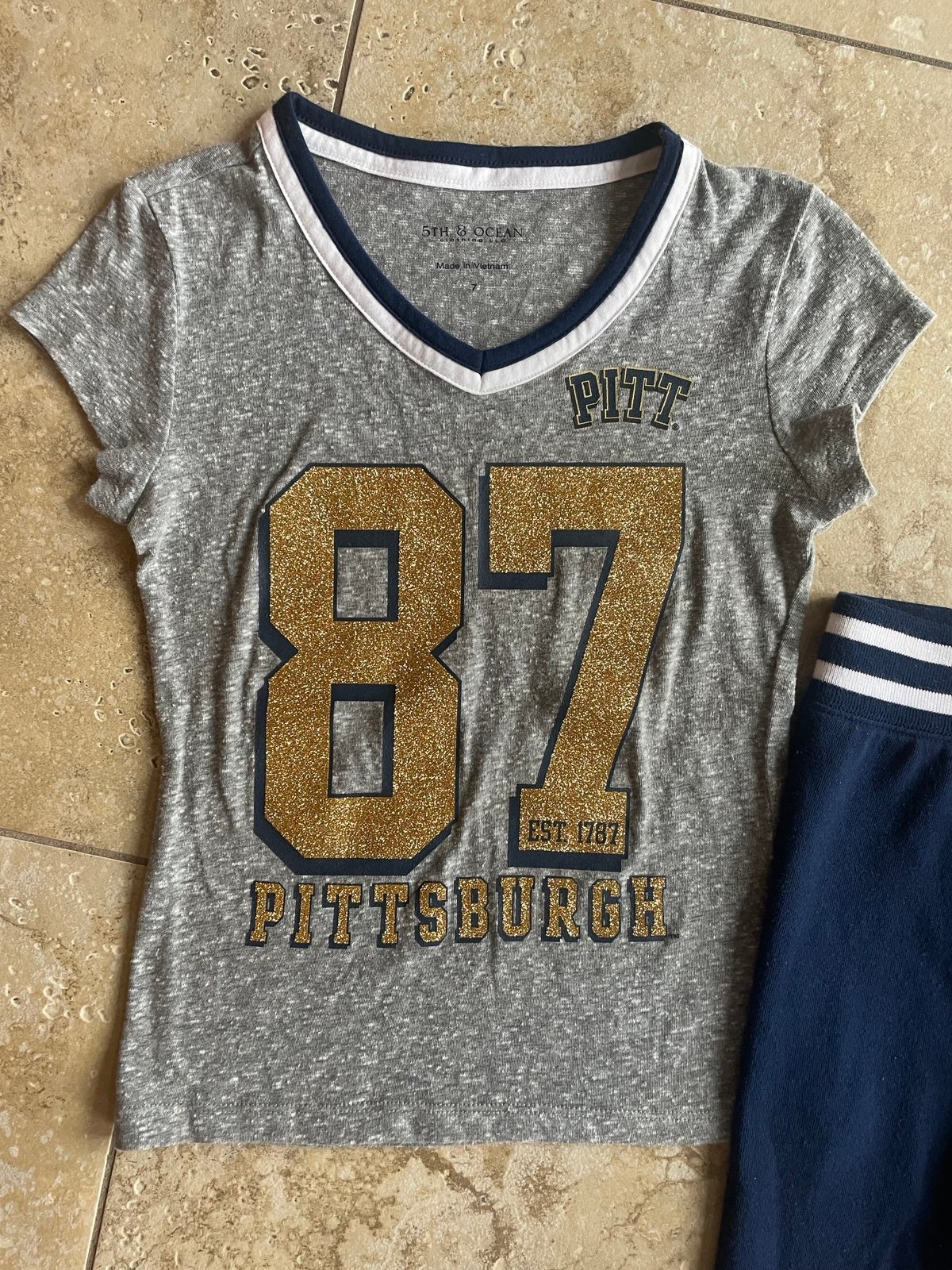 Let’s Go Pitt! This set will definitely ensure that your child is a seasoned supporter. Perfect to wear at a game or out and about the town. Kids sizing - Girls size 7.