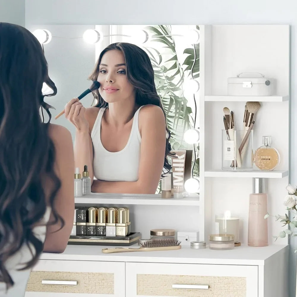 Vanity Mirror with Lights and Table Set: A large mirror with 10 adjustable LED bulbs, providing a total of 3 modes that can be adjusted, including cool, warm, and neutral tones, each tone has two modes of light and dark. The color of the light is adjustable so you can get just the right lighting for you and your room