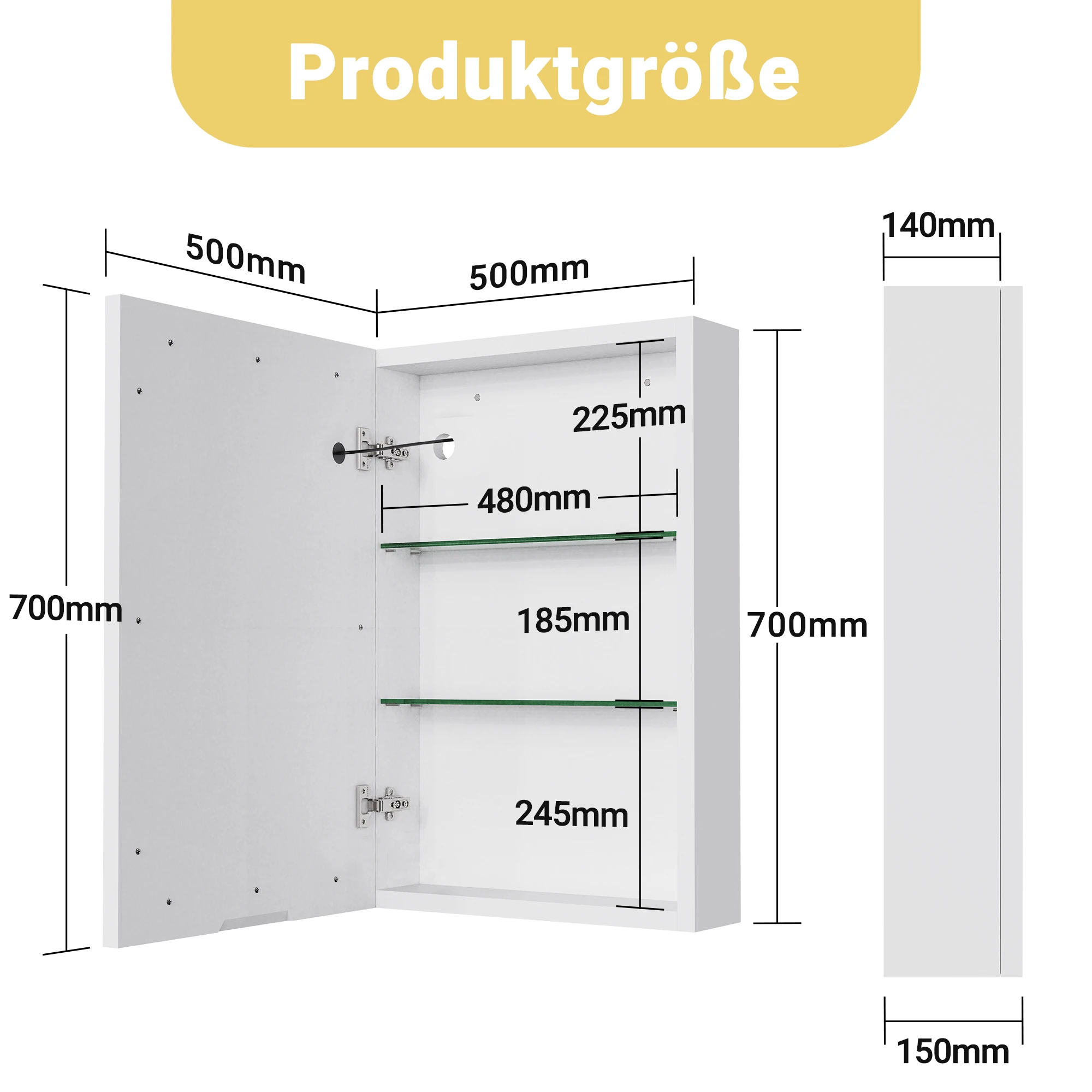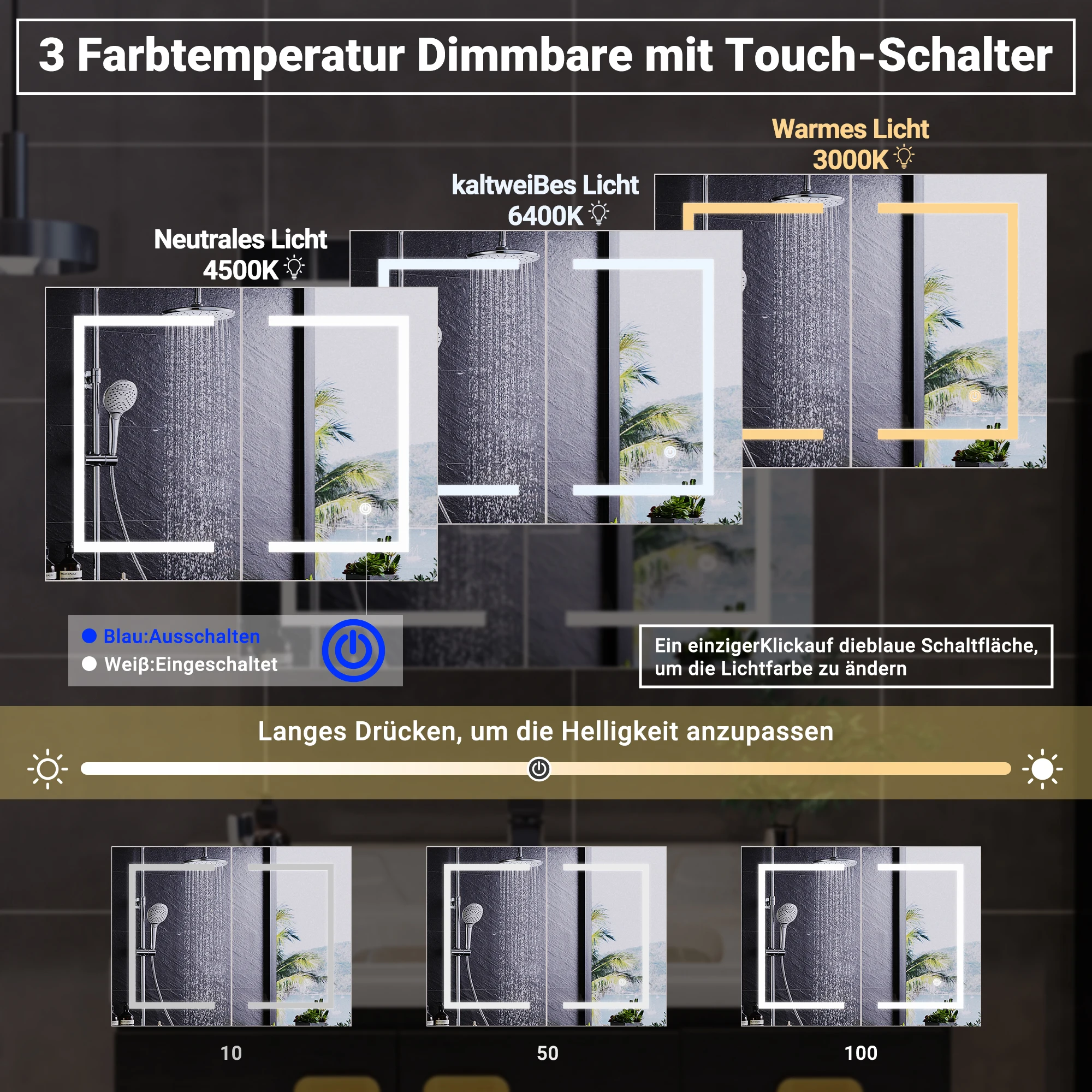 This bathroom mirror cabinet with mirrored door is equipped with innovative LED lighting and provides clear and natural light. With three dimmable colors (cold light, warm light and daylight) and a lighting range from 3000 K to 6400 K, you can adjust the light according to your wishes. Just touch the blue switch on the mirror to turn on the lighting, switch between the three types of light or dim the brightness.
