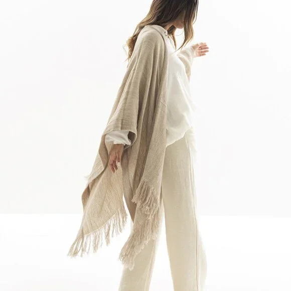 Soft and delicate made with fine yarns of pure merino wool for comfort, warmth and elegance, ideal to be used on different occasions. Follows global standards to protect the animals, the land they graze, and the environment.*Measurements: L 65” W 54” with 4.7” Fringe*Garment Composition :30% Llama70% Merino Wool