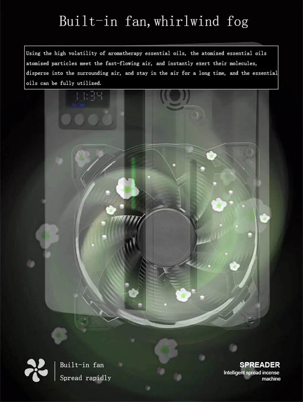Equipped with an integrated fan, this diffuser disperses scent evenly throughout the room for optimal aroma therapy experience.