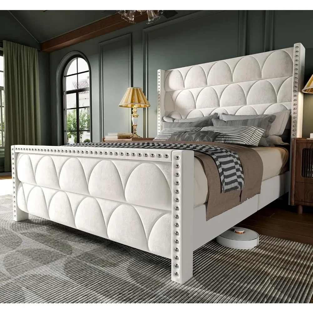 • ✅ BEAUTIFUL VELVET PLATFORM BED FRAME: The elegant nailhead trim and semicircle tufted design on both the headboard and footboard perfectly blend vintage and modern styles to complement any décor in your new living space. The smooth, soft cream velvet fabric adds luxurious touch to your sleep space. Whether in your master bedroom or guest room, it will leave both family and guests in awe of your impeccable taste
