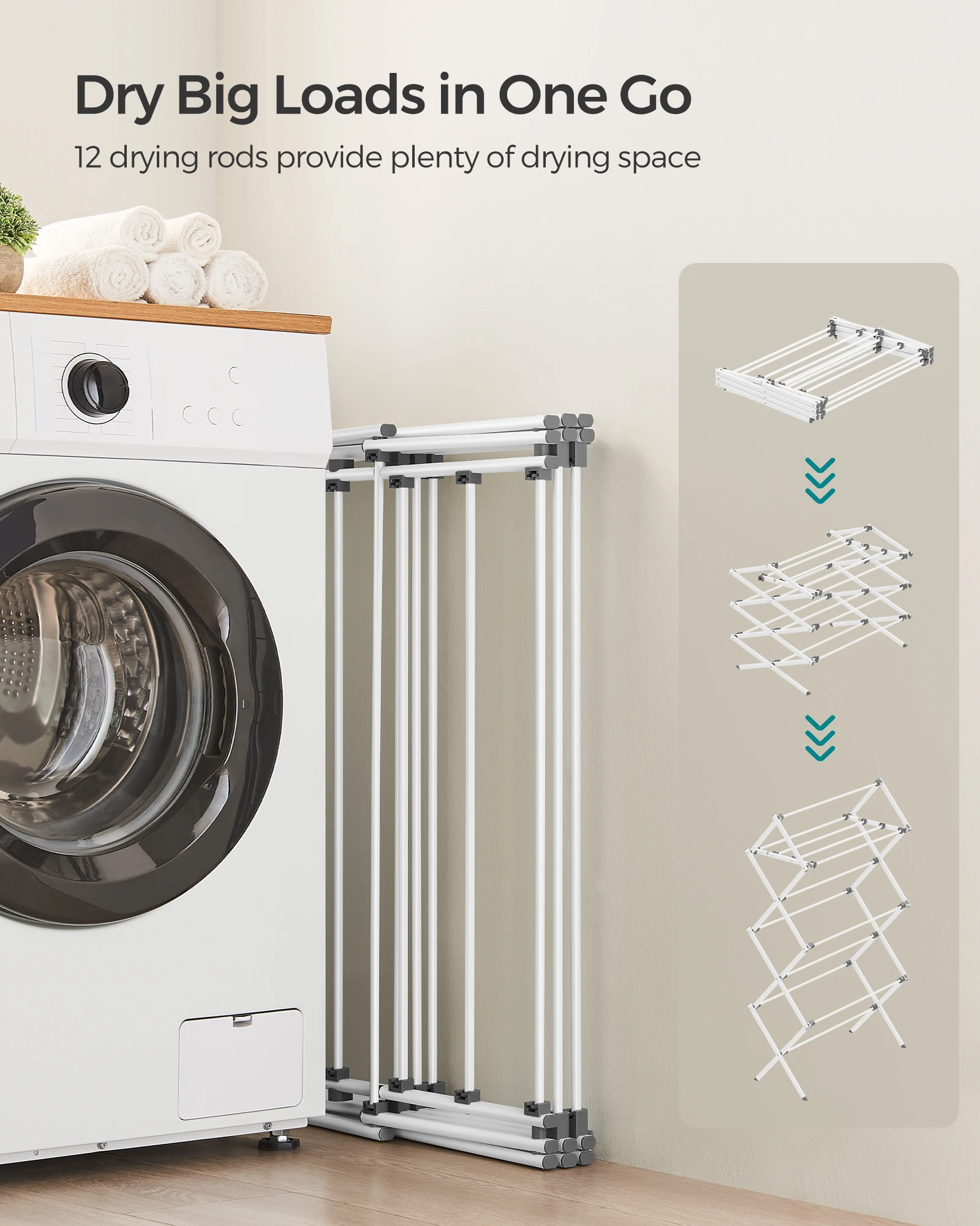 [Dry More in Less Space] Taking up only 14.6”D x 29.5”W floor space, this compact clothes airer offers plenty of drying space with its 12 rods, accommodating your towels, scarves, shoes, and more