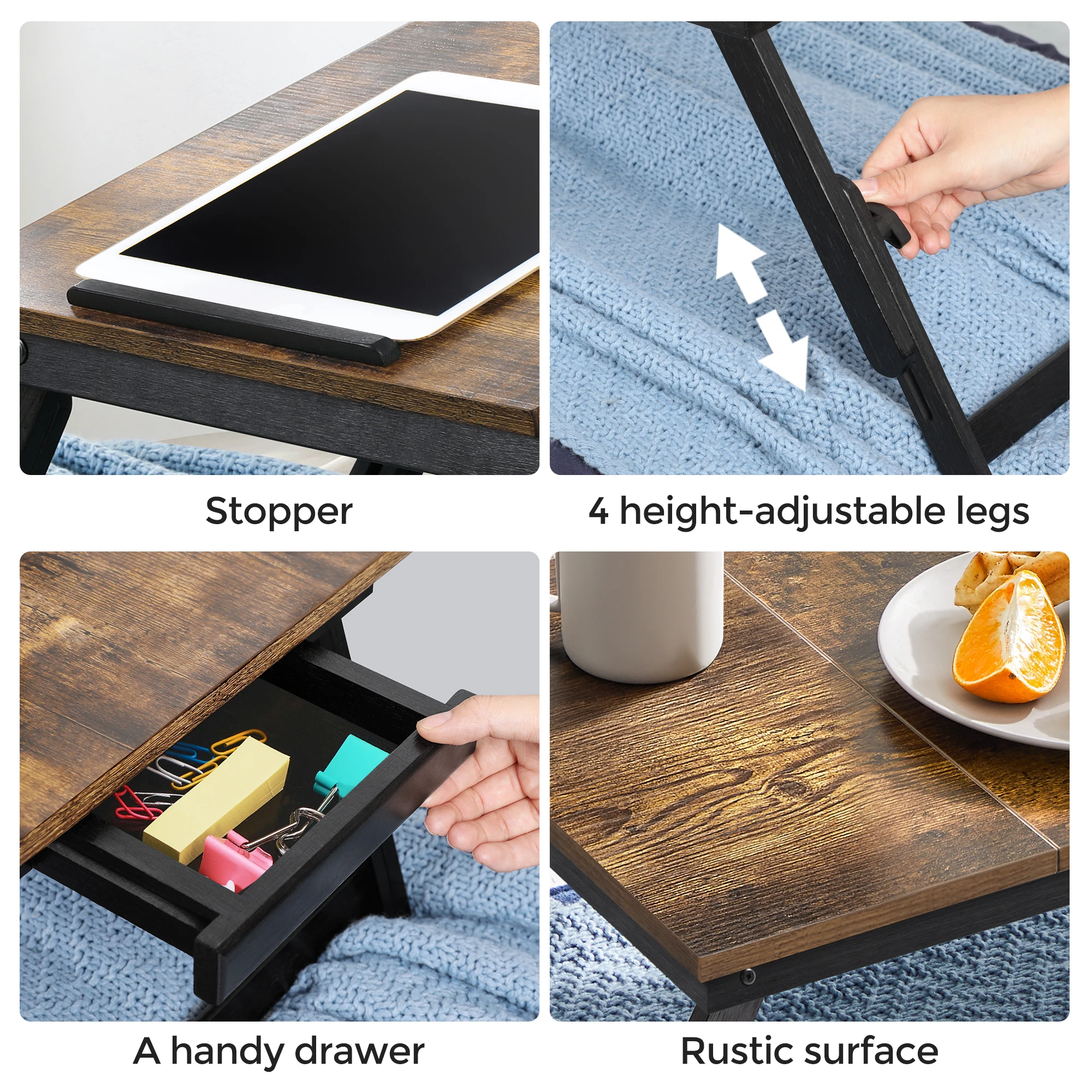 • [Let the Versatility Flow]: Remove the laptop, flatten the tilt top, and put the stopper in the handy drawer on the side, ta-da! A 13.8”D x 27.5”W desktop! What would you like to do on it? Do arts and crafts while sitting on the sofa? Or have breakfast in bed?