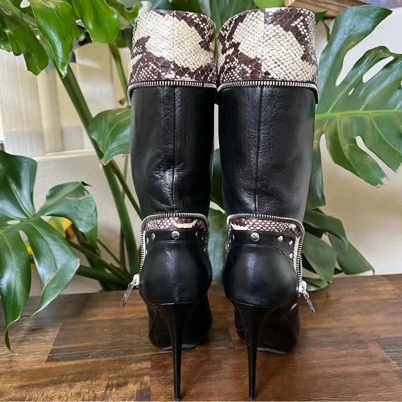 Tabitha Simmons “Heidi” Black Snakeskin Nappa Leather Stiletto BootsSize - EU38, US8MSRP - $1,695Color - Black, snakeskin print trimMaterial - Nappa LeatherStyle - StilettoHeel - 5”Accent - studded and zip trimCondition - New Without BoxGorgeous super soft Nappa leather tall boots! Zip and studded trim adds a moto look to these beauties!Please see all pictures and video for details!