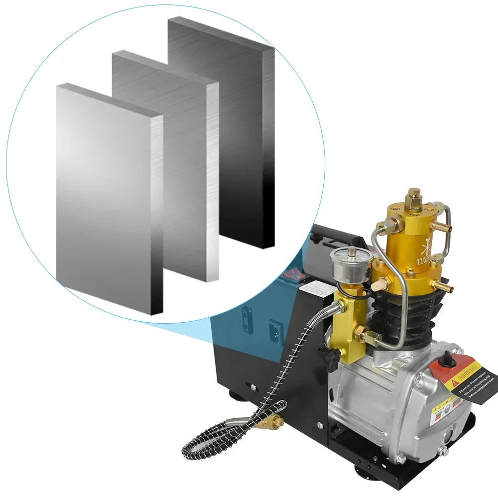 【Adjustable pressure】- The PCP compressor features a Adjustable pressure gauge and a temperature gauge. The compressor can easily achieve 4500Psi/300Bar and automatically stop filling when the preset air pressure is reached.
