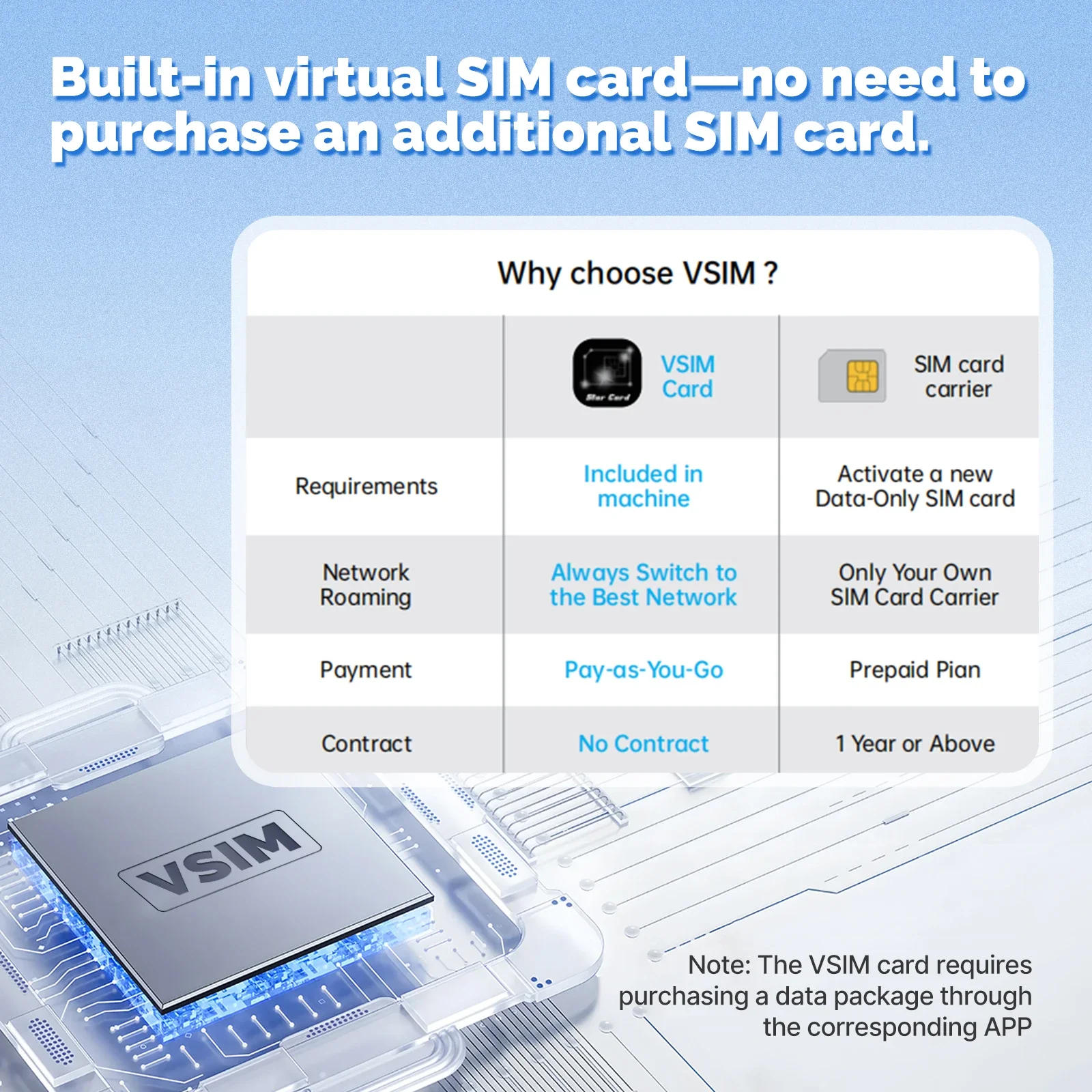 ✅ VSIM Technology—Seamless Network Switching —No Physical SIM Card Required (Data Purchase Needed).