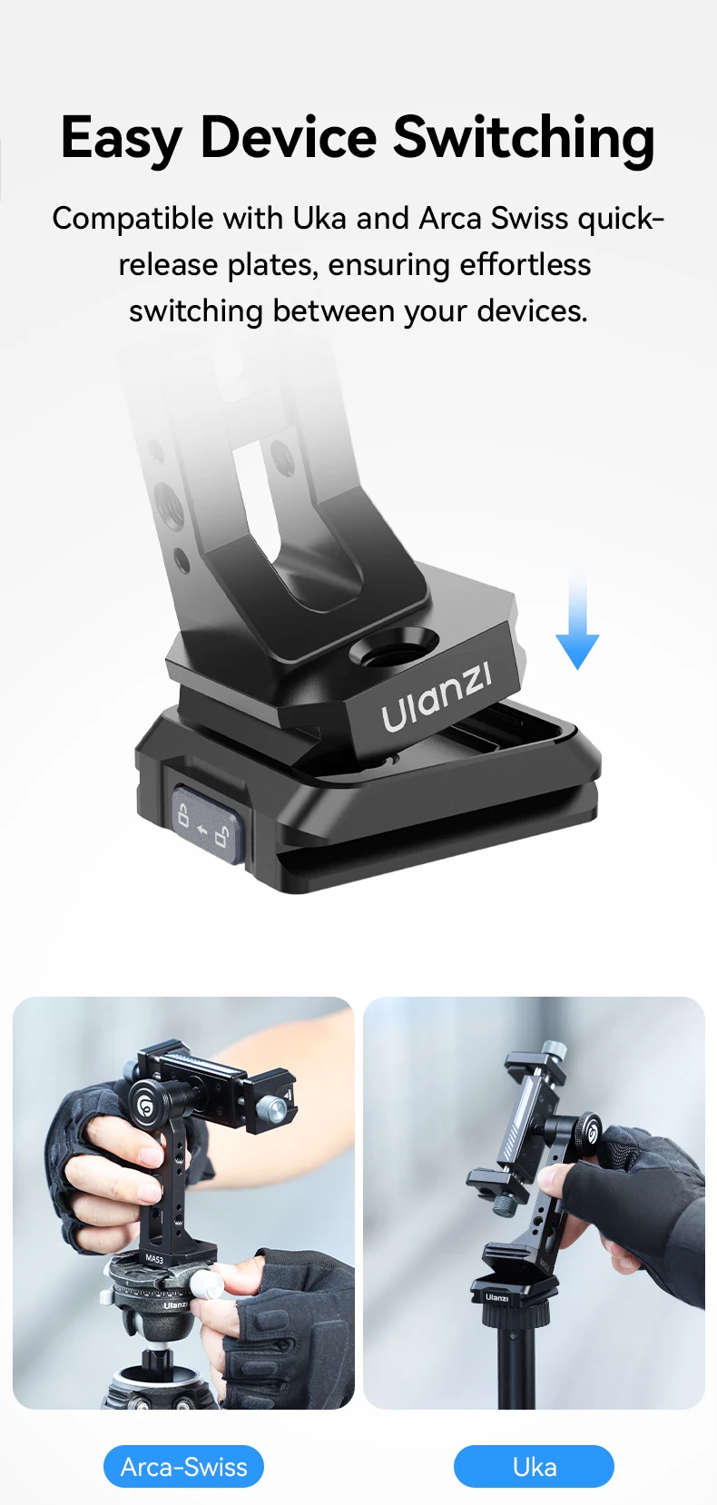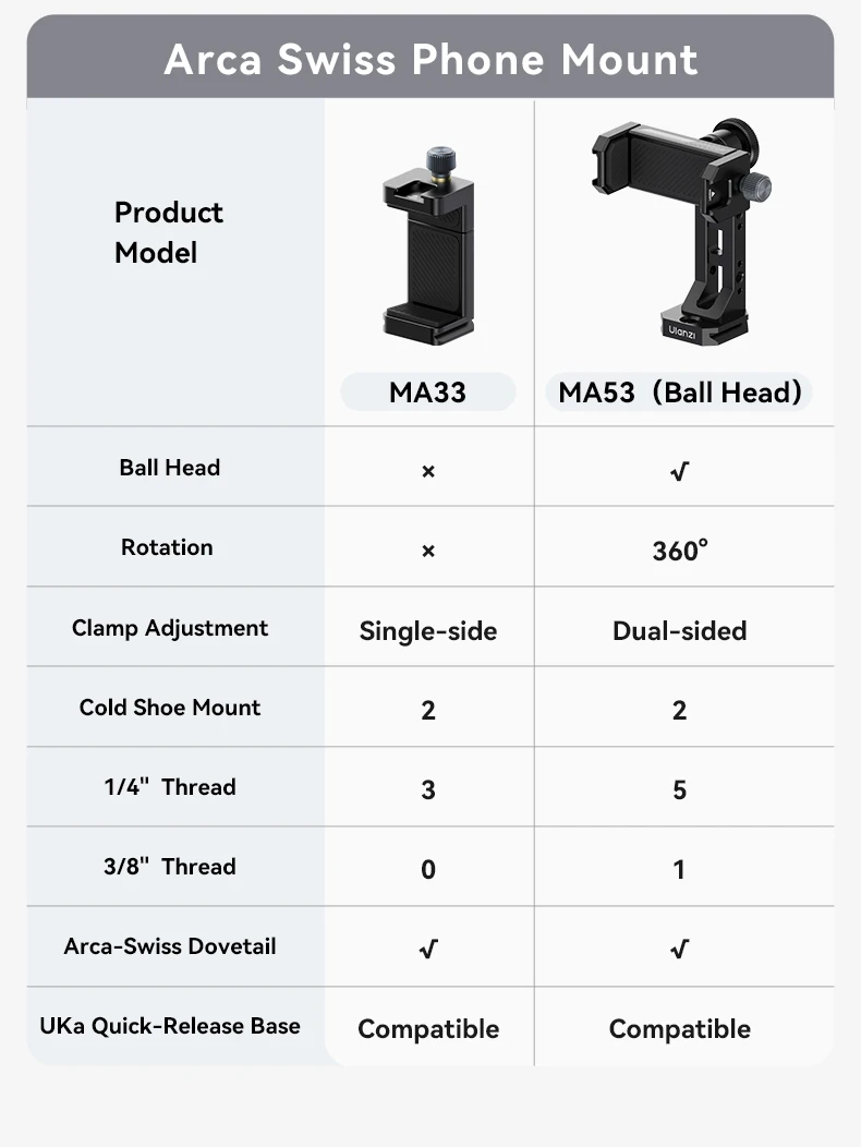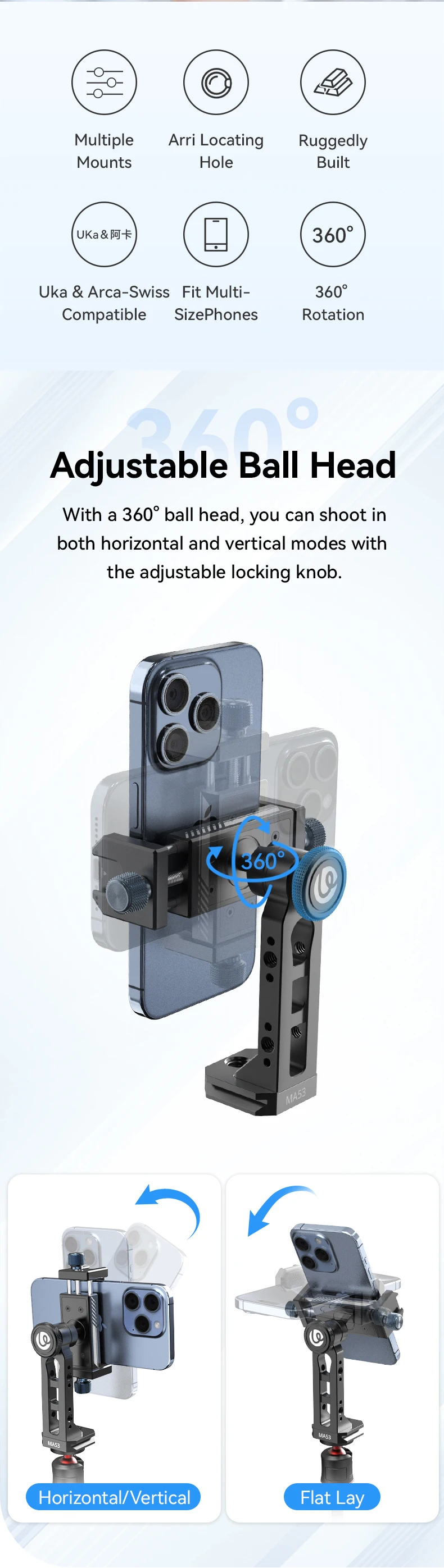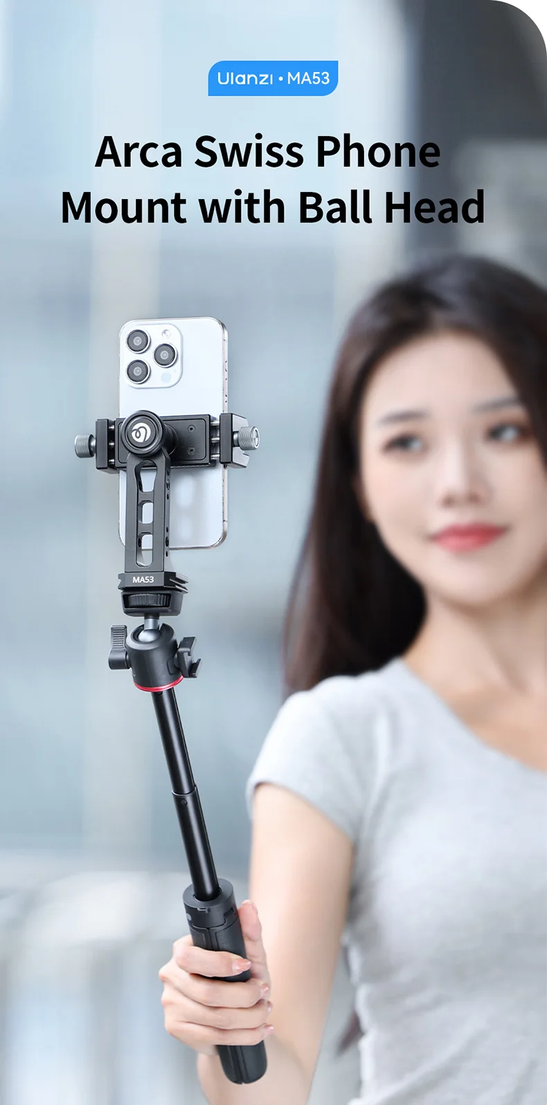 Ulanzi MA53 Tripod Phone Mount, Smartphone Tripod Adapter with Arca Swiss/Uka Port, 2 Cold Shoe, 360° Metal Cellphone Tripod Adapter, iPhone Samsung Holder Tripod for Photo Video Vlogging Rig