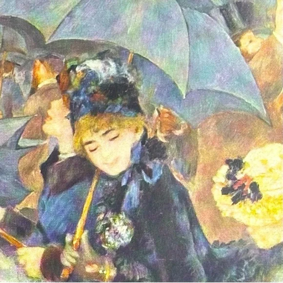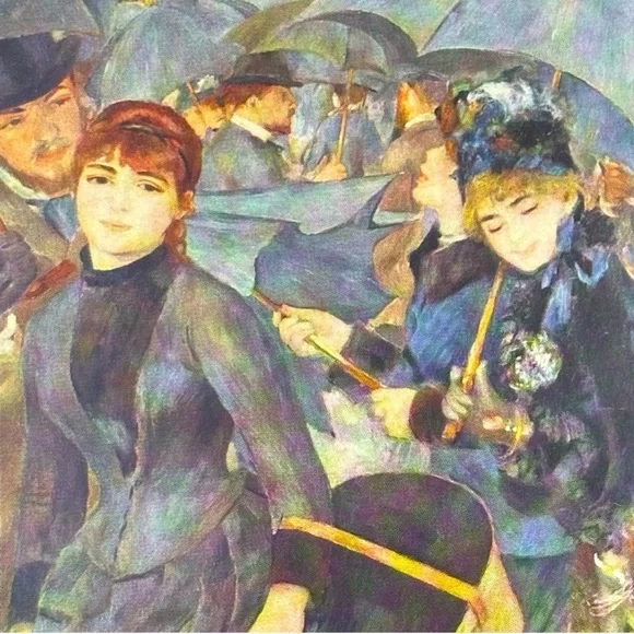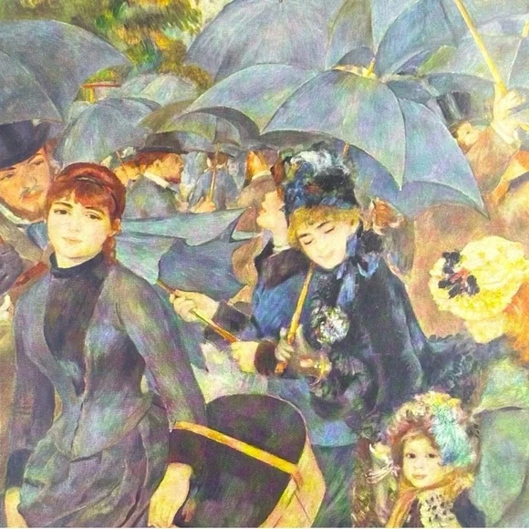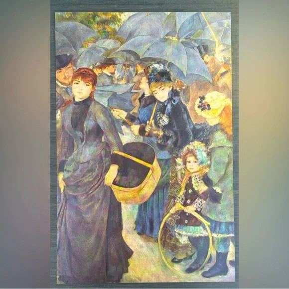 This piece has been in a cabinet in our house for decades.It is originally from the 1950’s…Quality Printed in YugoslaviaTHE UMBRELLAS, 1879Original Vintage Art PrintAntique Collectible Ephemera SMALL SIZEPierre-Auguste Renoir, French: February 1841 – December 1919, was a French artist who was a leading painter in the development of the Impressionist style. As a celebrator of beauty and especially feminine sensuality, it has been said that “Renoir is the final representative of a tradition which runs directly from Rubens to Watteau."For an Impeccably Tasteful Home...It could be nicely matted and framed,or reserved in a collection for posterity.R0030We ship immediately,every business day!