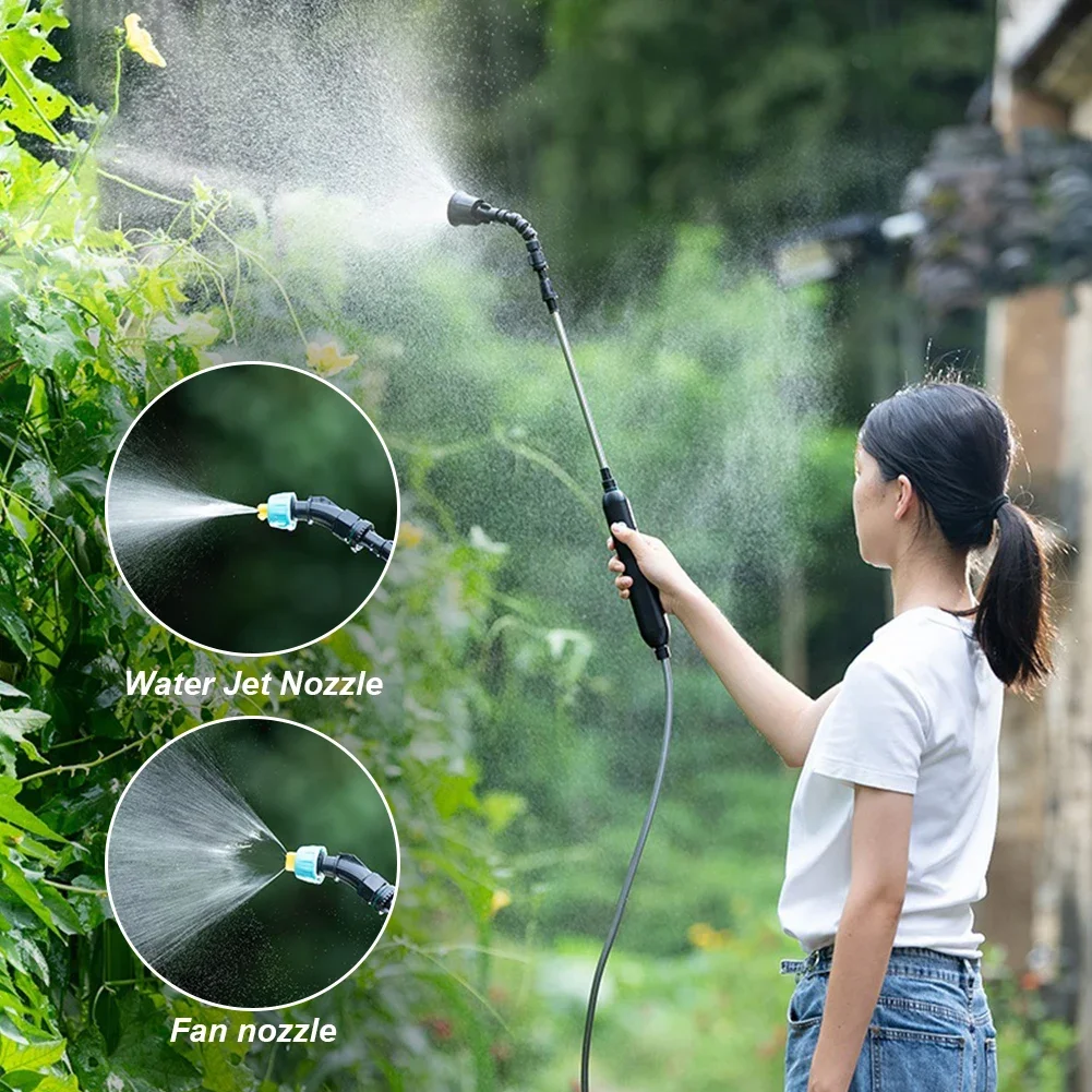 USB Rechargeable Portable Electric Sprayer with 2/4 Mist Nozzles Electric Garden Sprayer Powerful Electric Sprayer with Telescopic Handle Lawn Electric Sprayer Irrigation Tool for Gardening Cleaning Feature: 1. One-Touch Operation: Our lawn water sprayer is equipped with an electric operation that allows for automatic watering with just one button. Press the button again to turn it off. This enhanced convenience allows you to focus more on your gardening tasks. 2. Rechargeable and Long-Lasting: The portable electric sprayer is USB rechargeable, boasting a robust 2400mAh battery that can continuously work for 2-3 hours after a full charge. This feature ensures uninterrupted gardening and watering tasks. 3. Versatile Spray Modes: The electric sprayer offers two spray modes. By rotating the nozzle, you can switch between mist and column/fan-shaped/six-hole shower modes. Further expand the use of the spray can by swapping the extended nozzle to meet different work requirements. 4. Hose and Filter Ball Included: Equipped with a hose and filter ball, you don't have to carry a heavy water tank or bag all the time while watering. The filter ball at the bottom of the hose filters debris, powerful electric sprayer enabling use in natural water sources like rivers and lakes. 5. Multipurpose Use: This lawn electric sprayer is perfect for garden plant watering, indoor plant spraying, car cleaning, air humidifying, and glass cleaning. Its versatility makes it a valuable tool for various cleaning and watering needs.