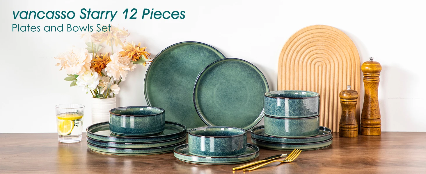 vancasso 12/24/36Piece Dinner set Black Green Reactive Glaze Vertical edge Dinnerware set with 4PCS Dinner Plate/ Dessert/Bowl