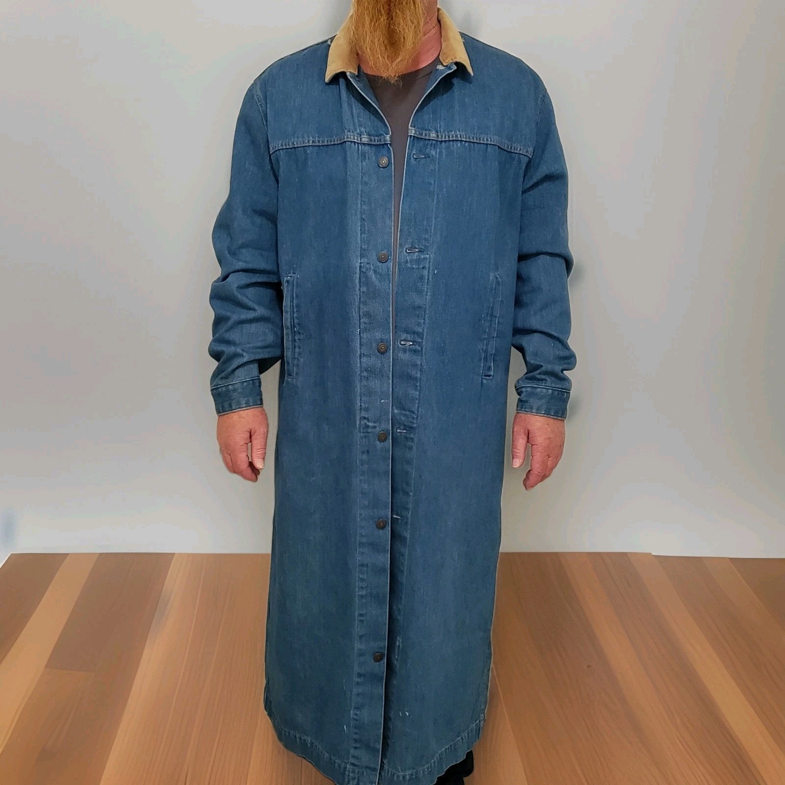 This Vintage Levi's Long Jacket Duster in size L is a classic piece made from cotton denim with a corduroy collar and cuffs. It features a button closure on the front and back vent opening. Collared neckline, and pockets, perfect for casual and workwear. The Levi's jacket has a solid blue washed color, some distressed areas around collar and shoulders as shown in pictures embodying a timeless American outdoor style that exudes a rugged, 80s/90s vibe. Made in the United States.