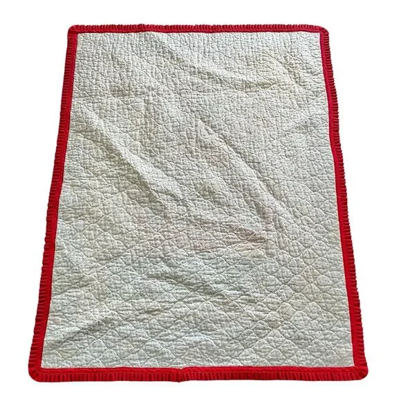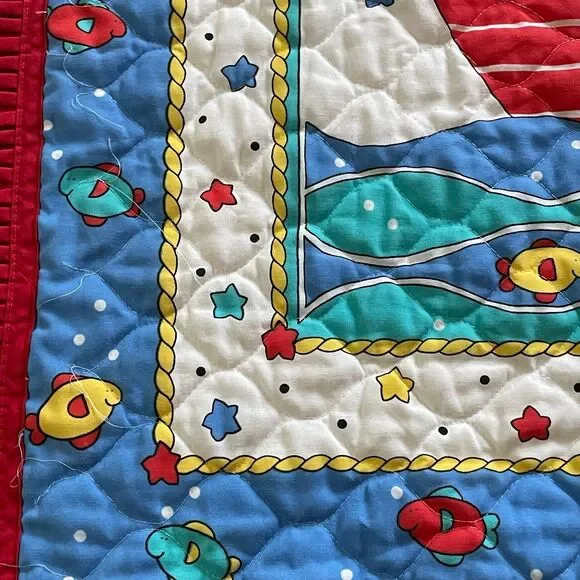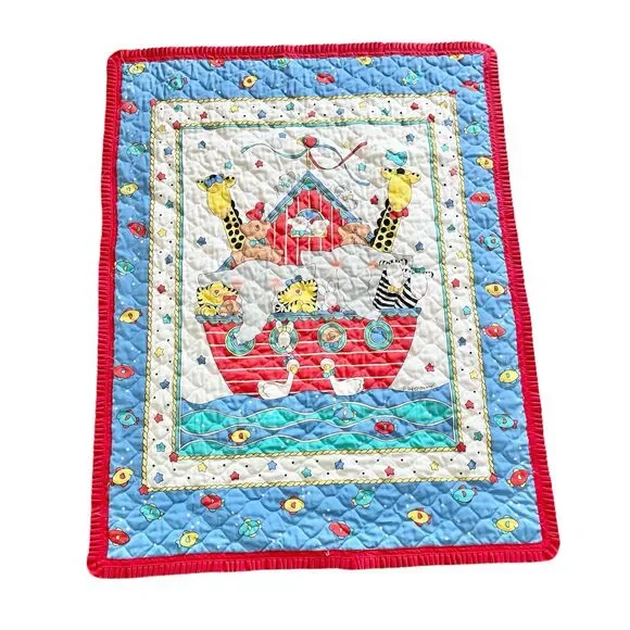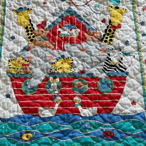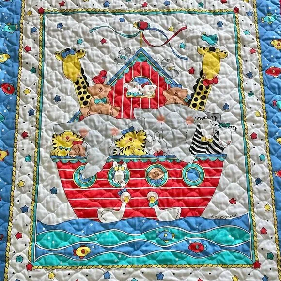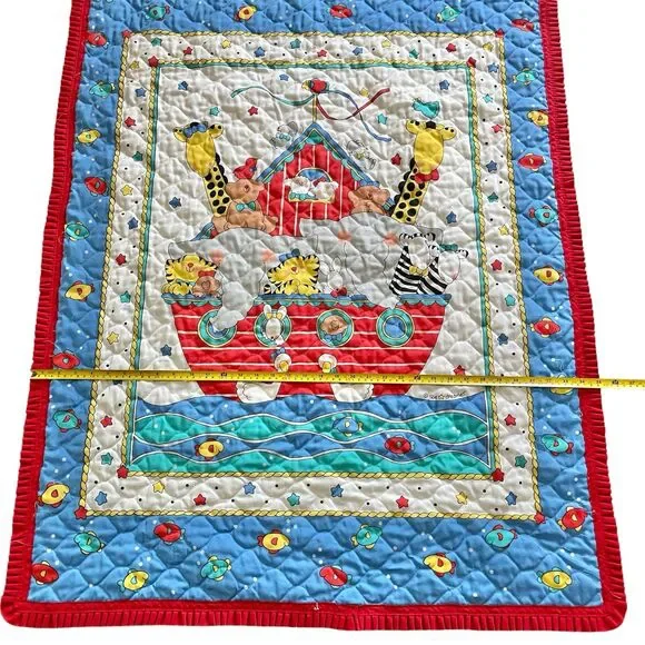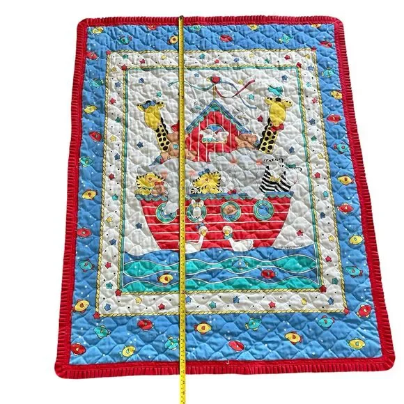 Vintage Noah's Ark quilt GUCsome yellow discoloration hard to seeloose threadsNoah's Ark with various animals, including giraffes, lions, and zebras.It has a colorful design with a blue border and a red ruffled edge.The central panel shows the ark on water, surrounded by a white and yellow patterned border.The quilt's dimensions are approximately 43 inches by 35 inches. Quilts like this are often made to commemorate events such as a birthThe ark design is based on the biblical story of Noah's Arkcolors might differ due to lighting, screen resolution etc12>148x9x34